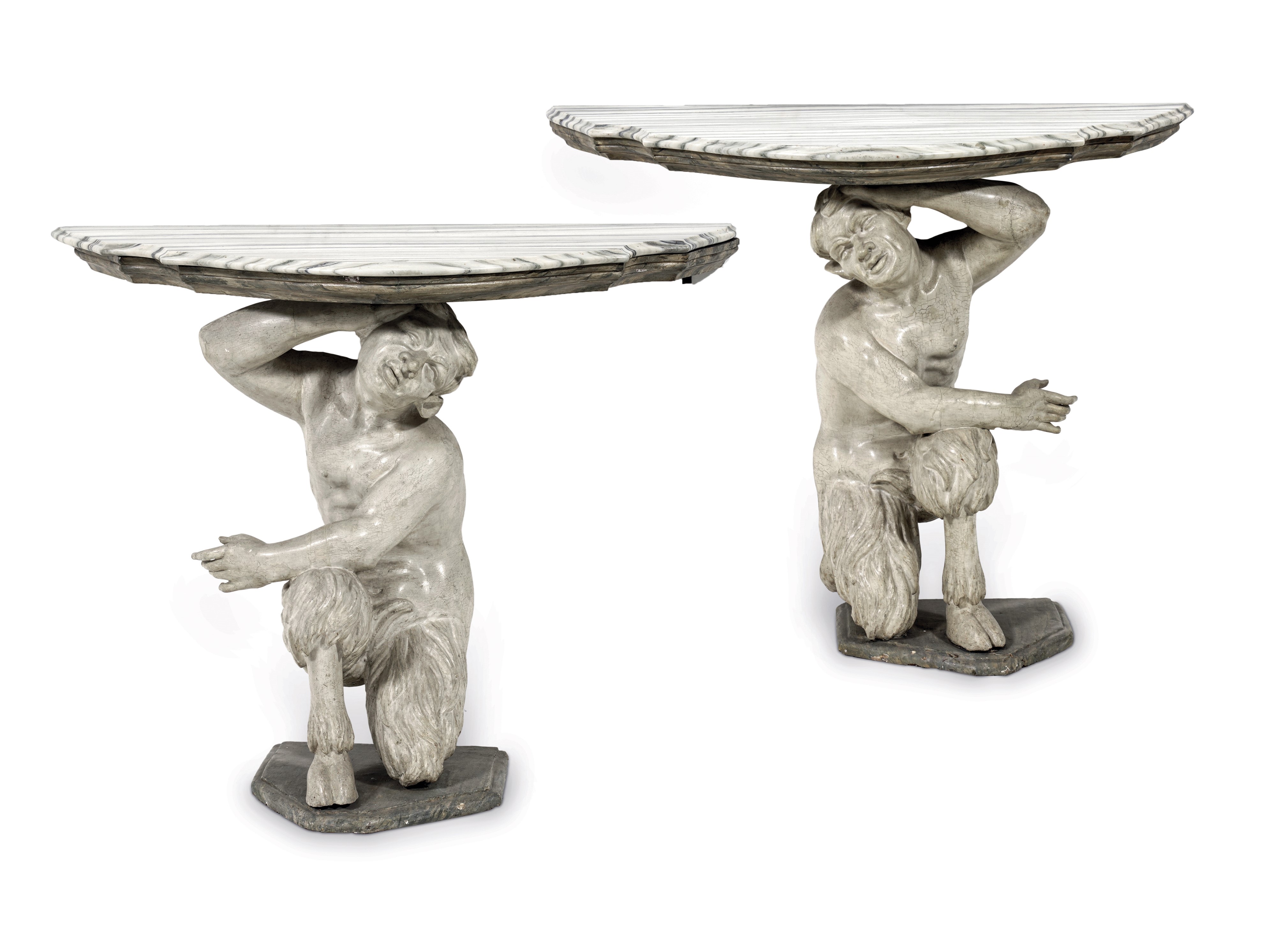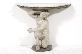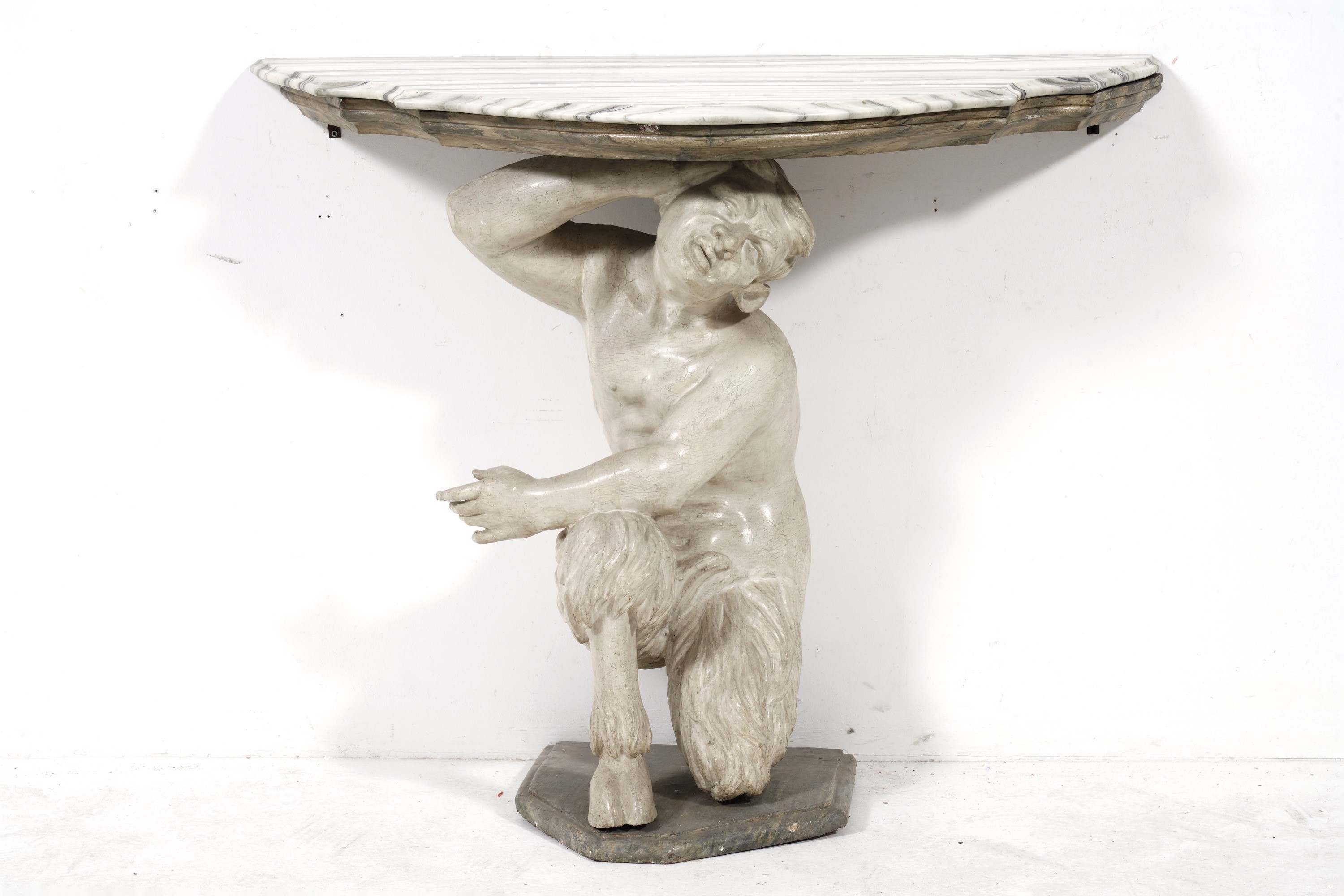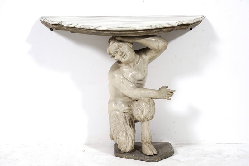 piano sagomato in marmo sorretto da sostegno centrale laccato e scolpito a raffigurare un satiro inginocchiato, base a mensola laccata a finto marmo