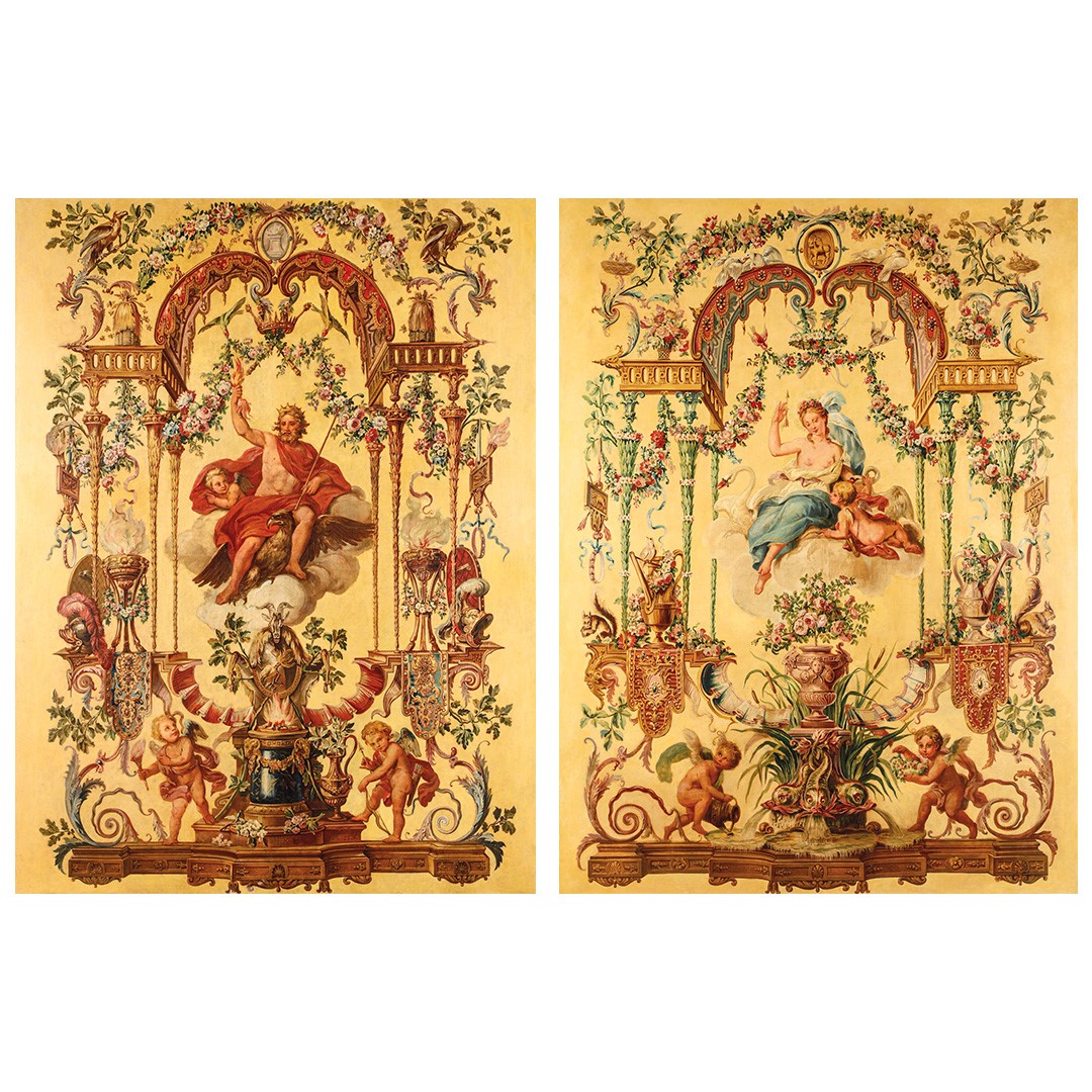 Coppia di grandi pannelli allegorici raffiguranti Giove e Venere, probabilmente Francia XIX secolo