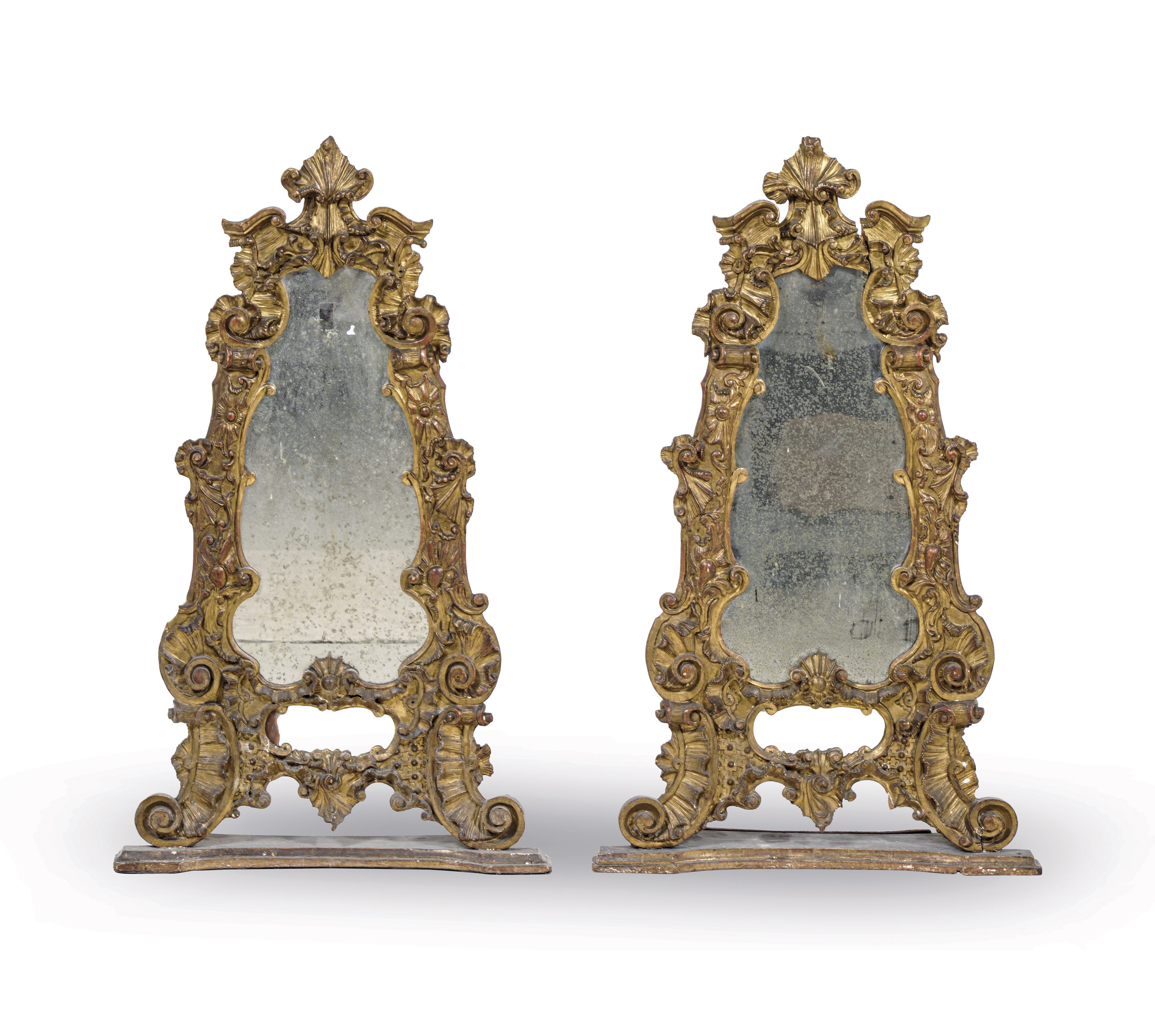 Coppia di specchiere da appoggio in legno scolpito e dorato. XVIII secolo
