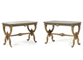 Coppia di tavoli da centro in legno laccato e dorato. XX secolo