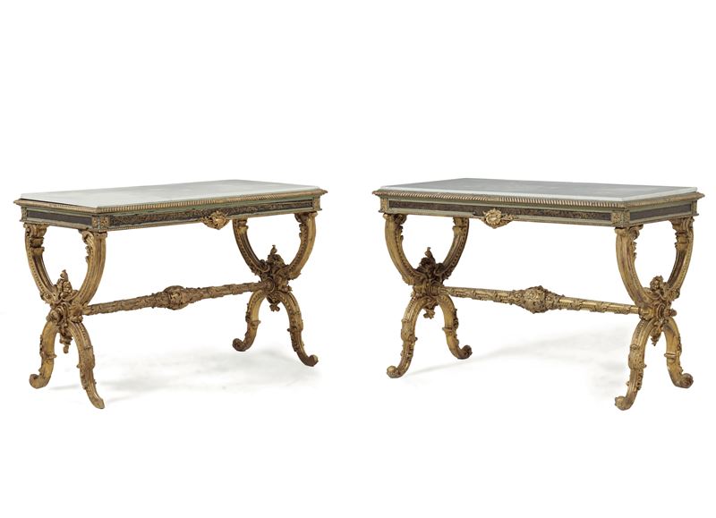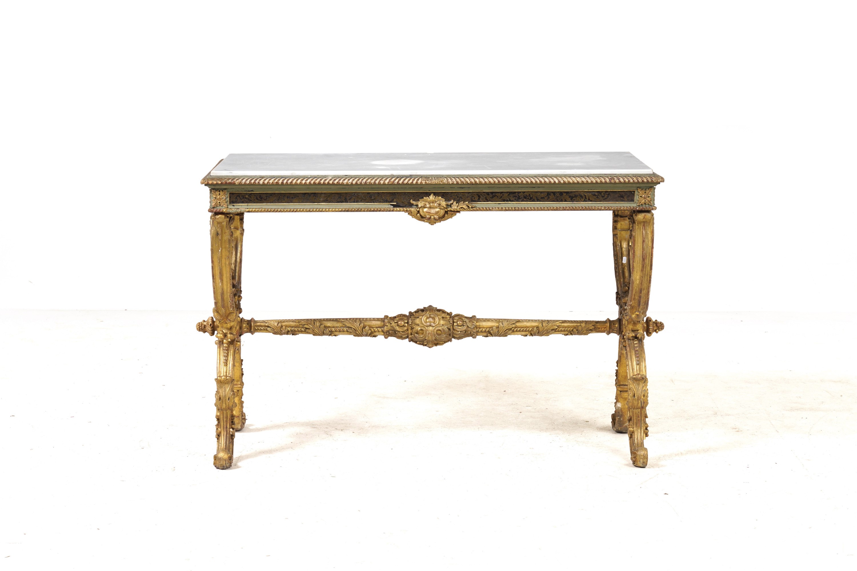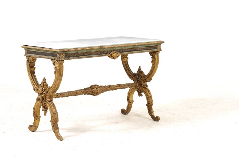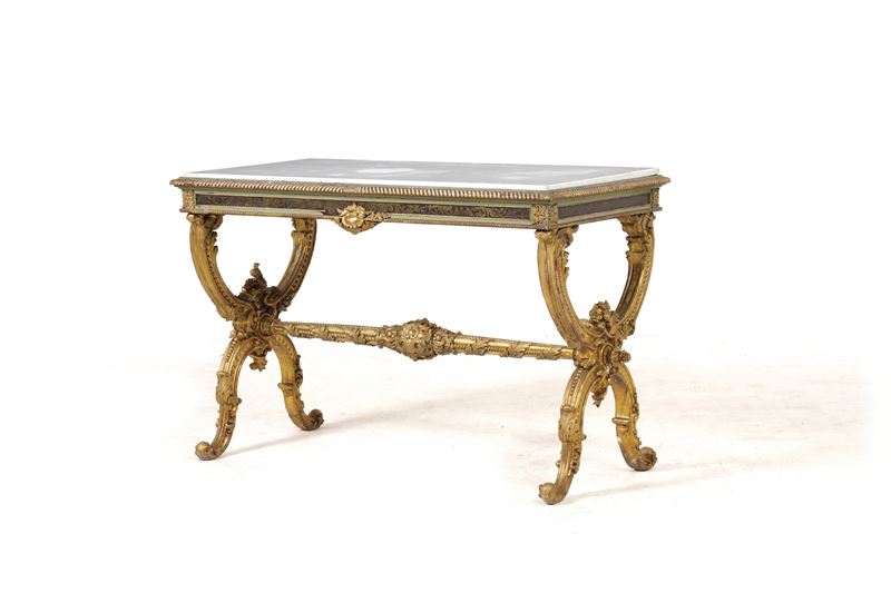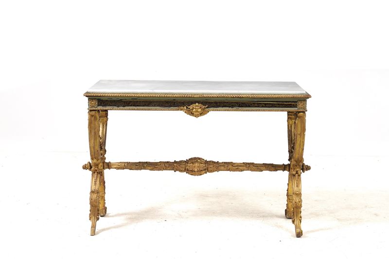 montanti a X in legno intagliato a motivi fitomorfi riuniti da traversa dritta decorata con girali a nastro e foglie d'acanto, fascia sottopiano con racemi fogliati dorati tra due modanature baccellate, piani in marmo bianco