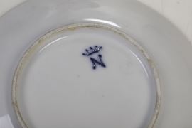 Porcellana policroma e dorata. Marca: “N” con corona in blu. Dimensioni: altezza tazza cm 5,2. diametro piattino cm 12,8. Conservazione: ottima