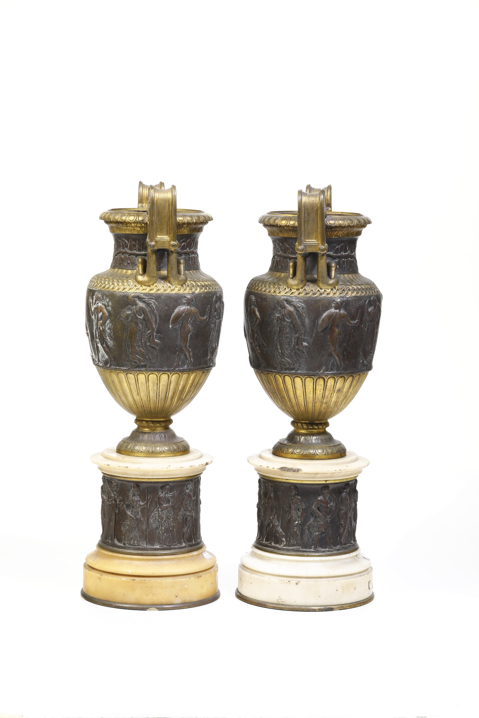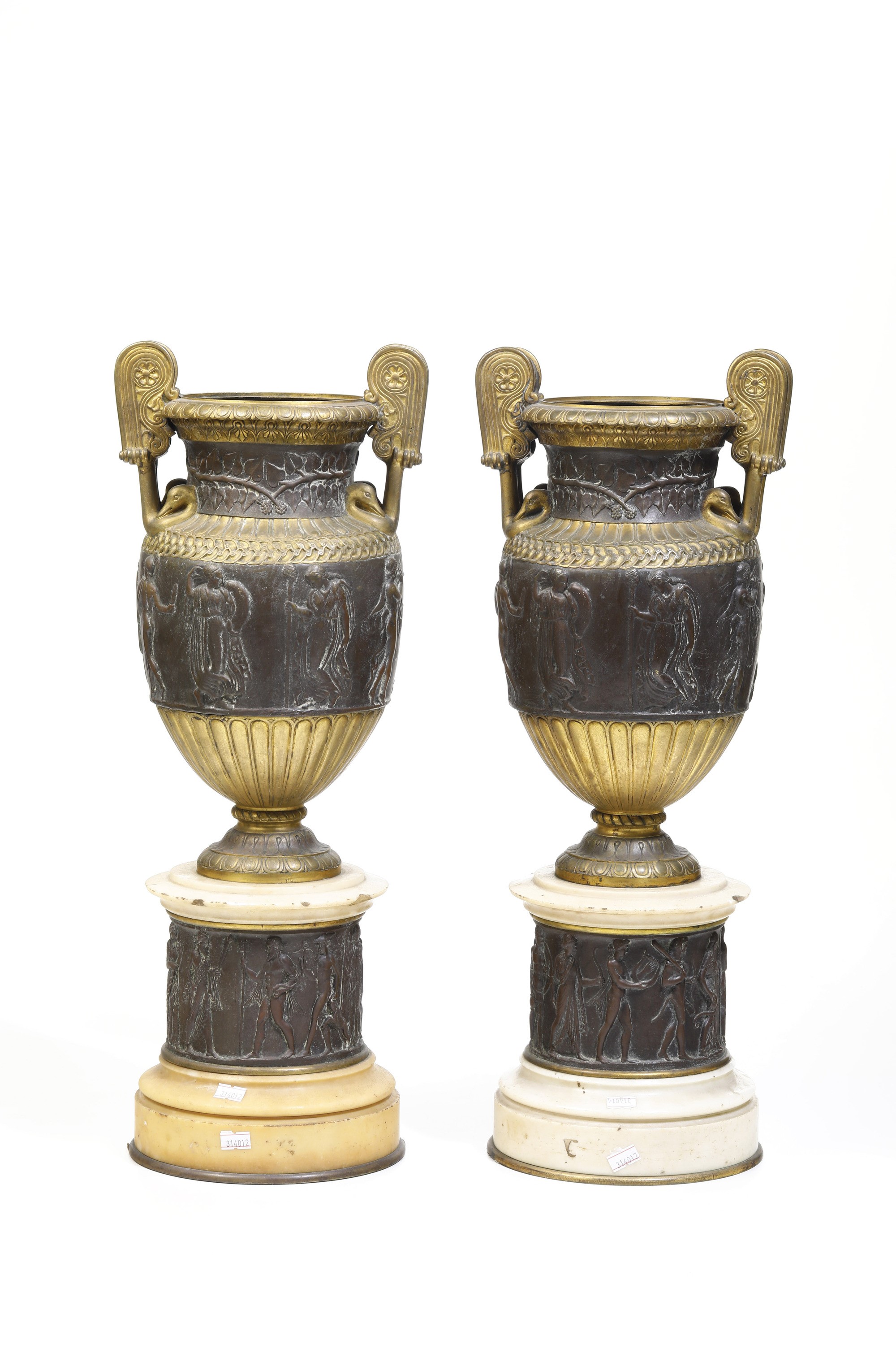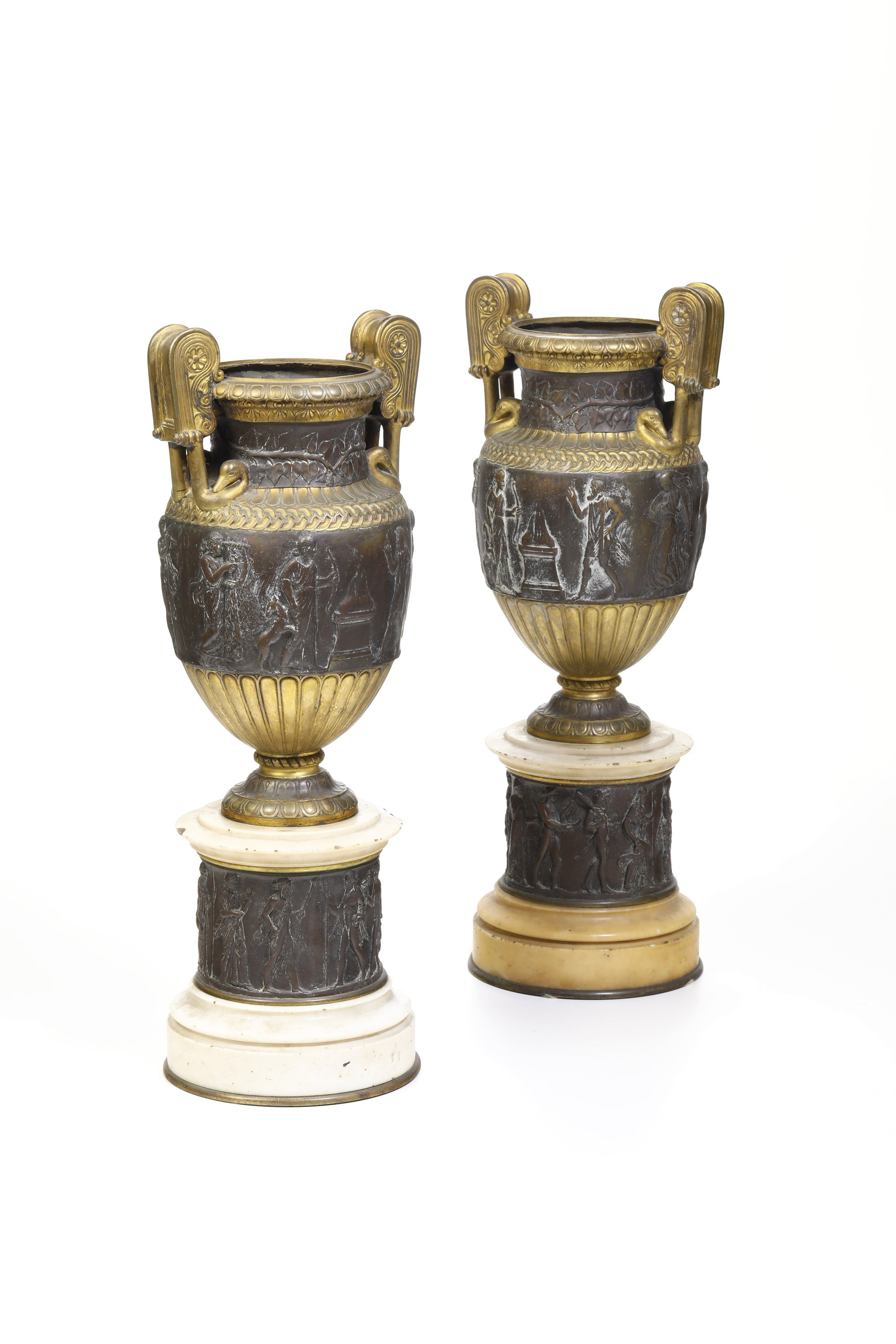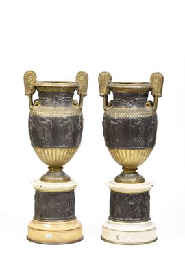 Coppia di vasi neoclassici in marmo e bronzo da modello tratto dall'antico. XIX secolo