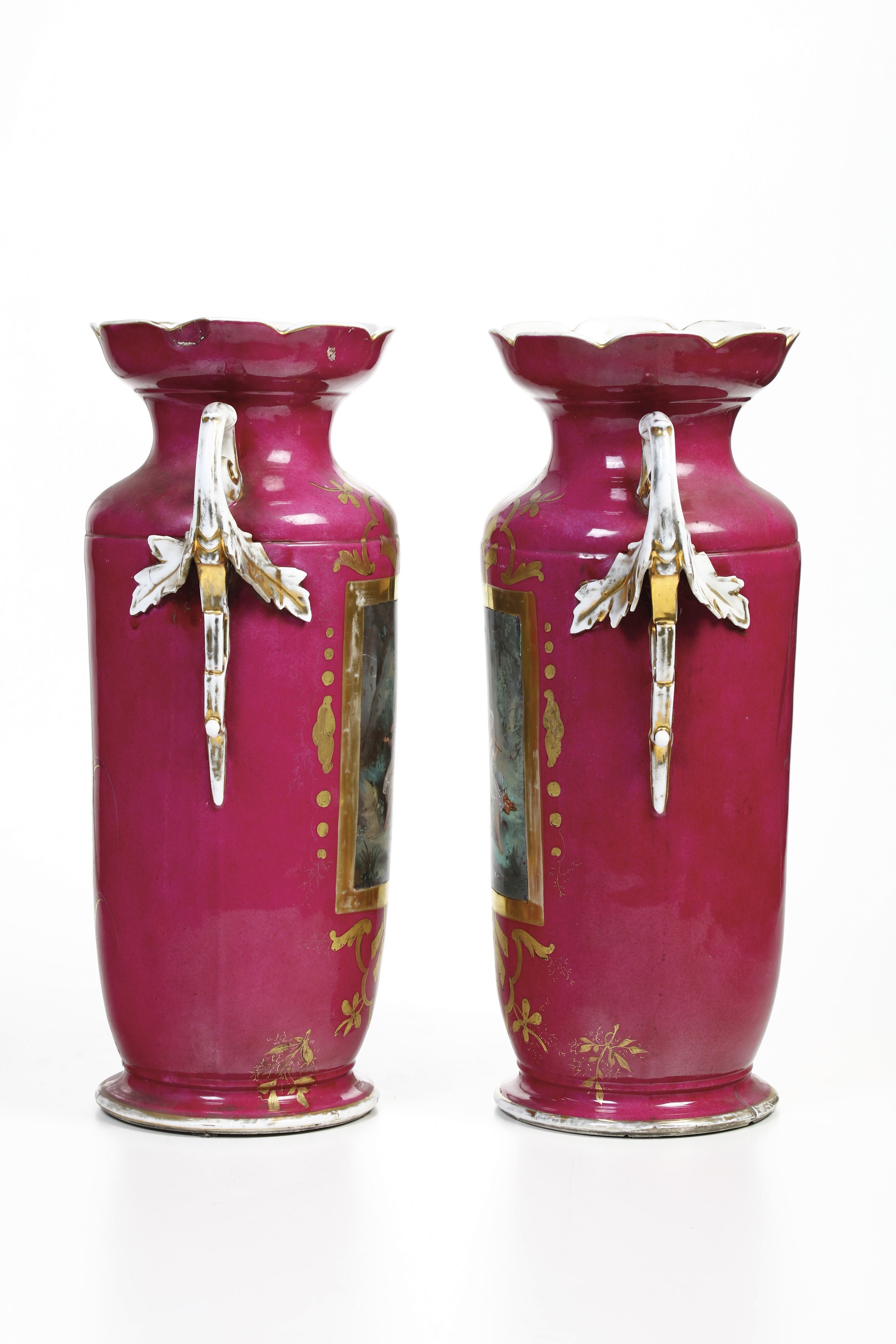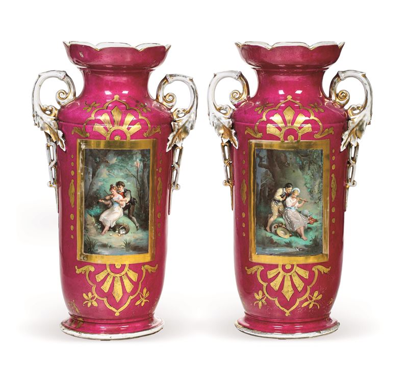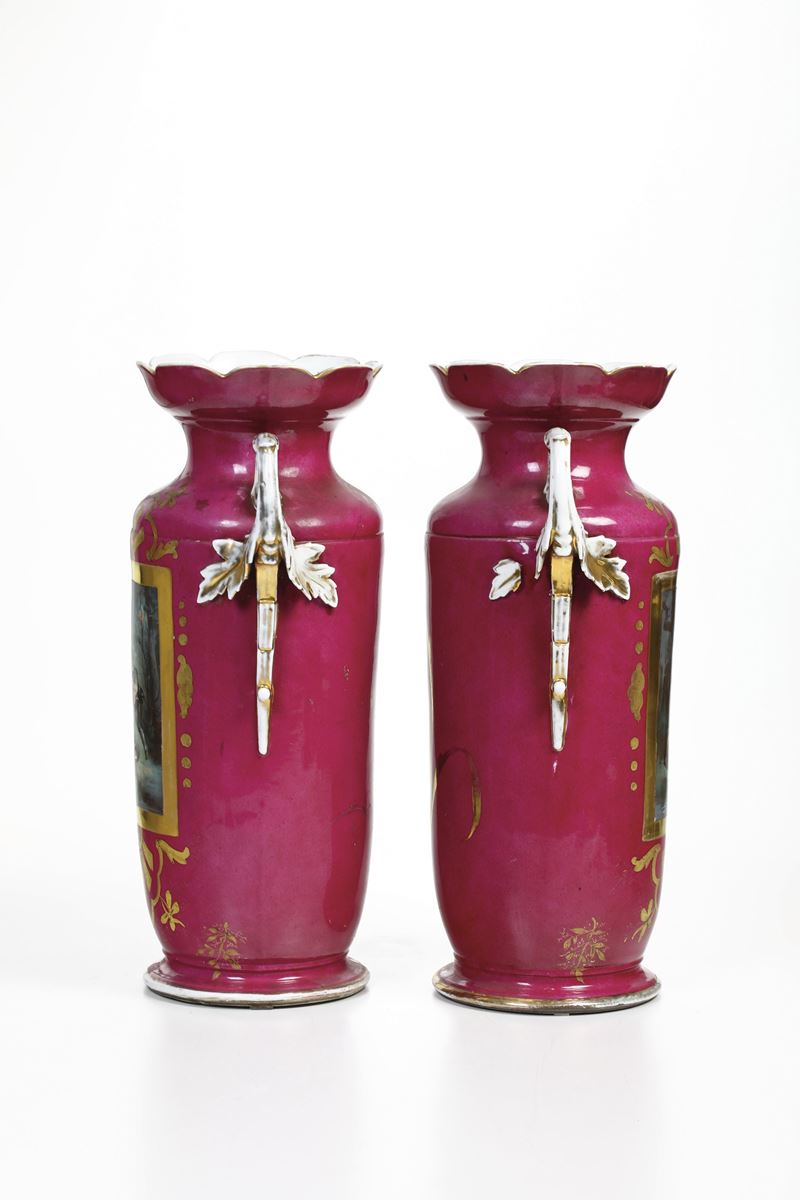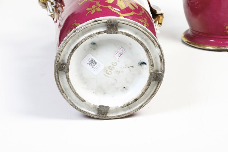 Porcellana. Marca: assente. Altezza cm 54. Conservazione: ottima; sbeccatura incollata all’orlo superiore di un vaso; usure all’oro