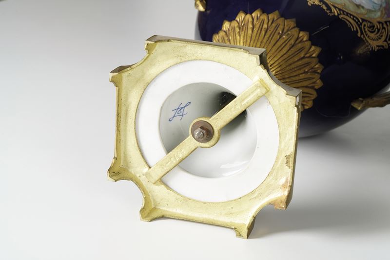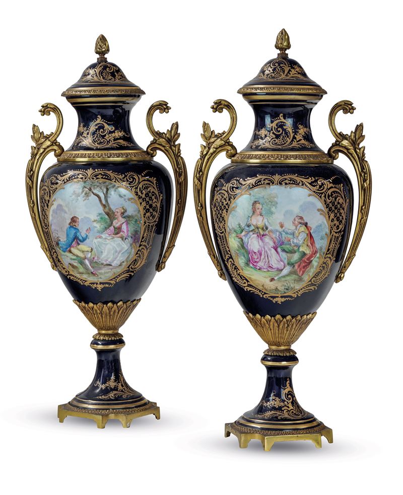 I vasi, dai raffinati manici in bronzo dorato e pomello dei coperchi a pigna, ospitano sul fondo blu cobalto arricchito da rocailles in oro, una riserva policroma con scena galante di ispirazione settecentesca
