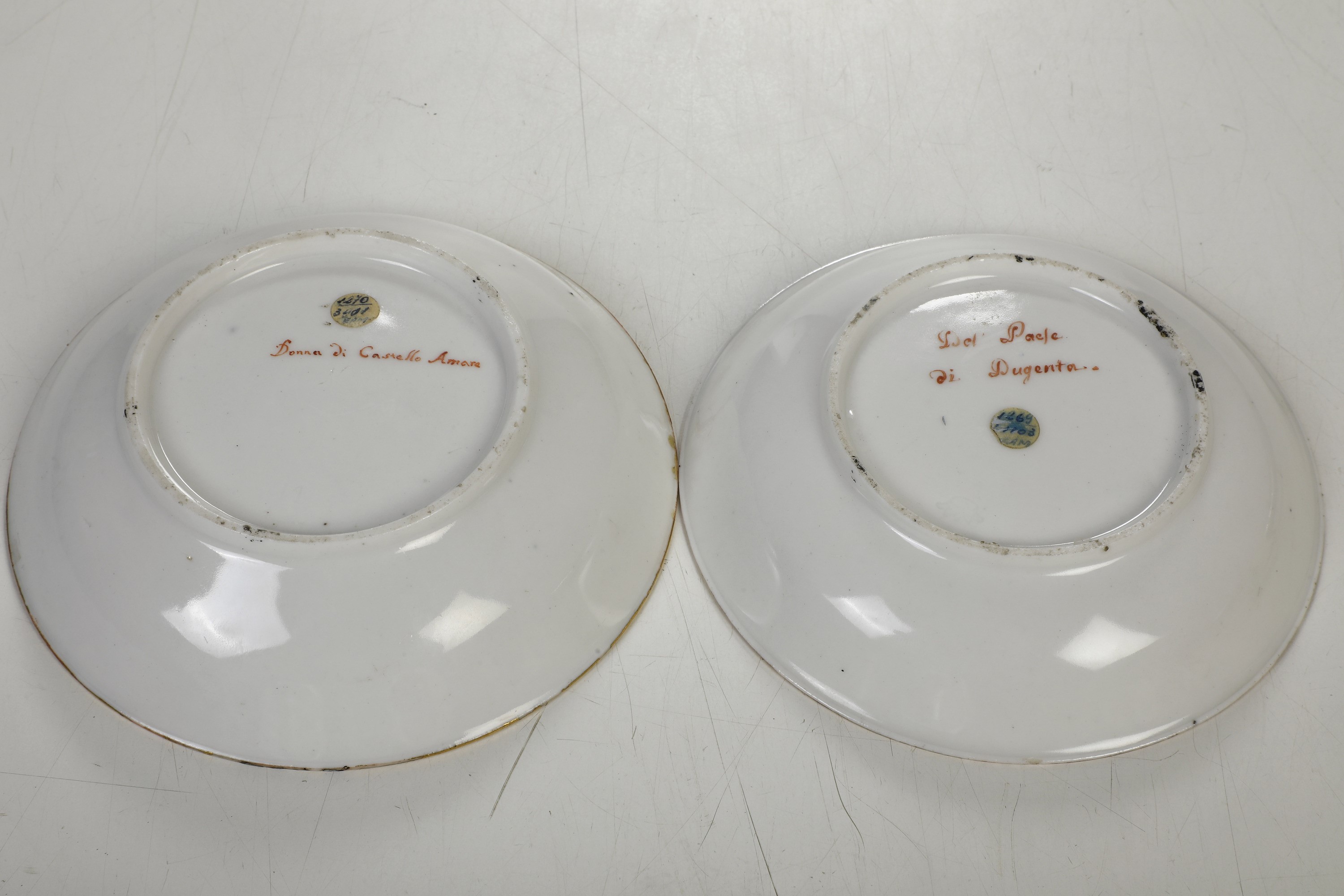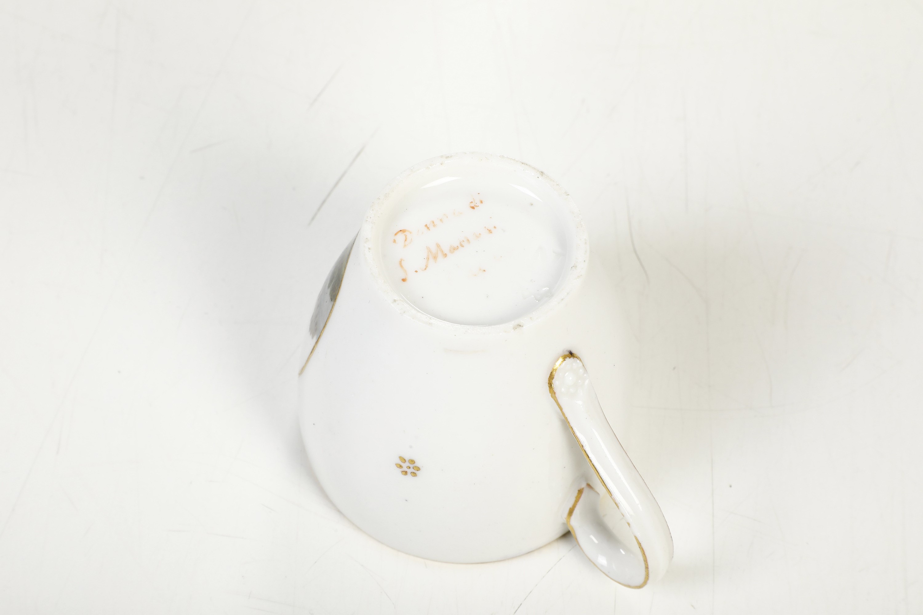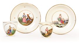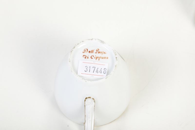 Porcellana policroma e dorata. Marca: assente. Dimensioni: altezza tazza cm 6; diametro piattino cm 13,5 circa. Conservazione: una tazza con felatura e piccolo restauro al bordo superiore; leggere usure all’oro