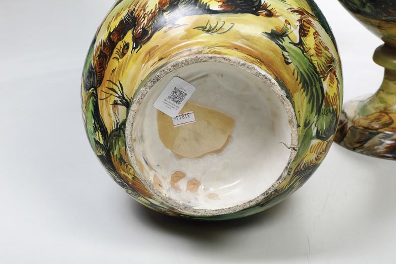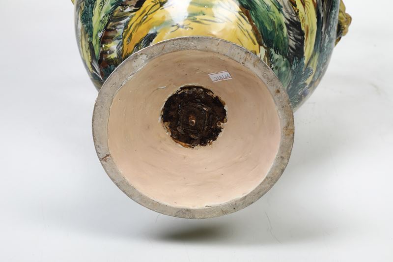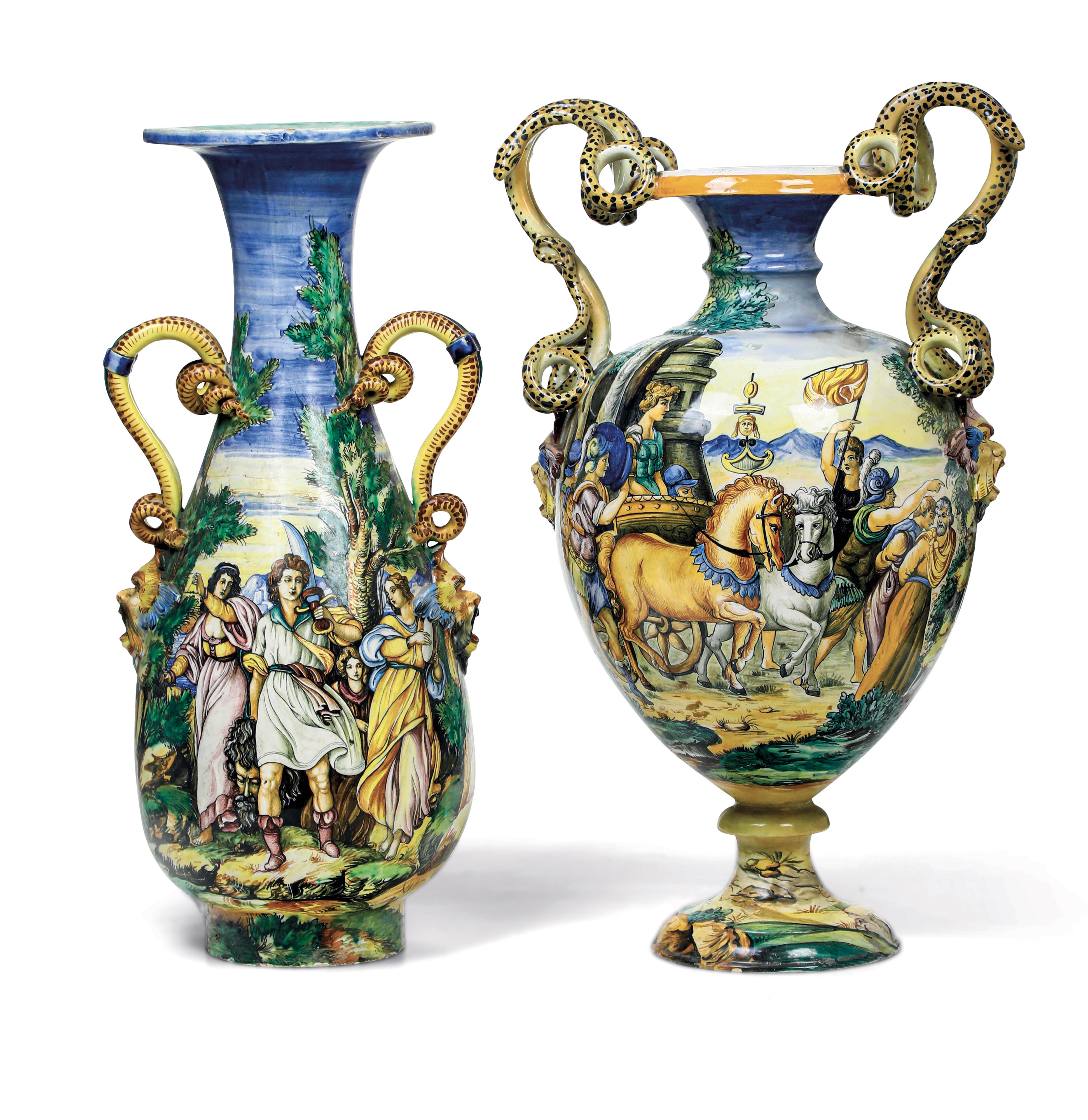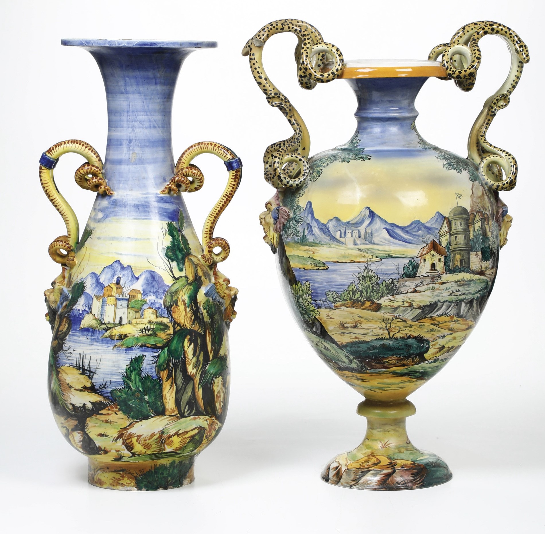 Maiolica. Marca: assente. Altezza massima cm 68. Conservazione: un piede rotto e ricomposto in restauro; un’ansa e parte del corpo restaurati; mancanza alla coda di una serpe