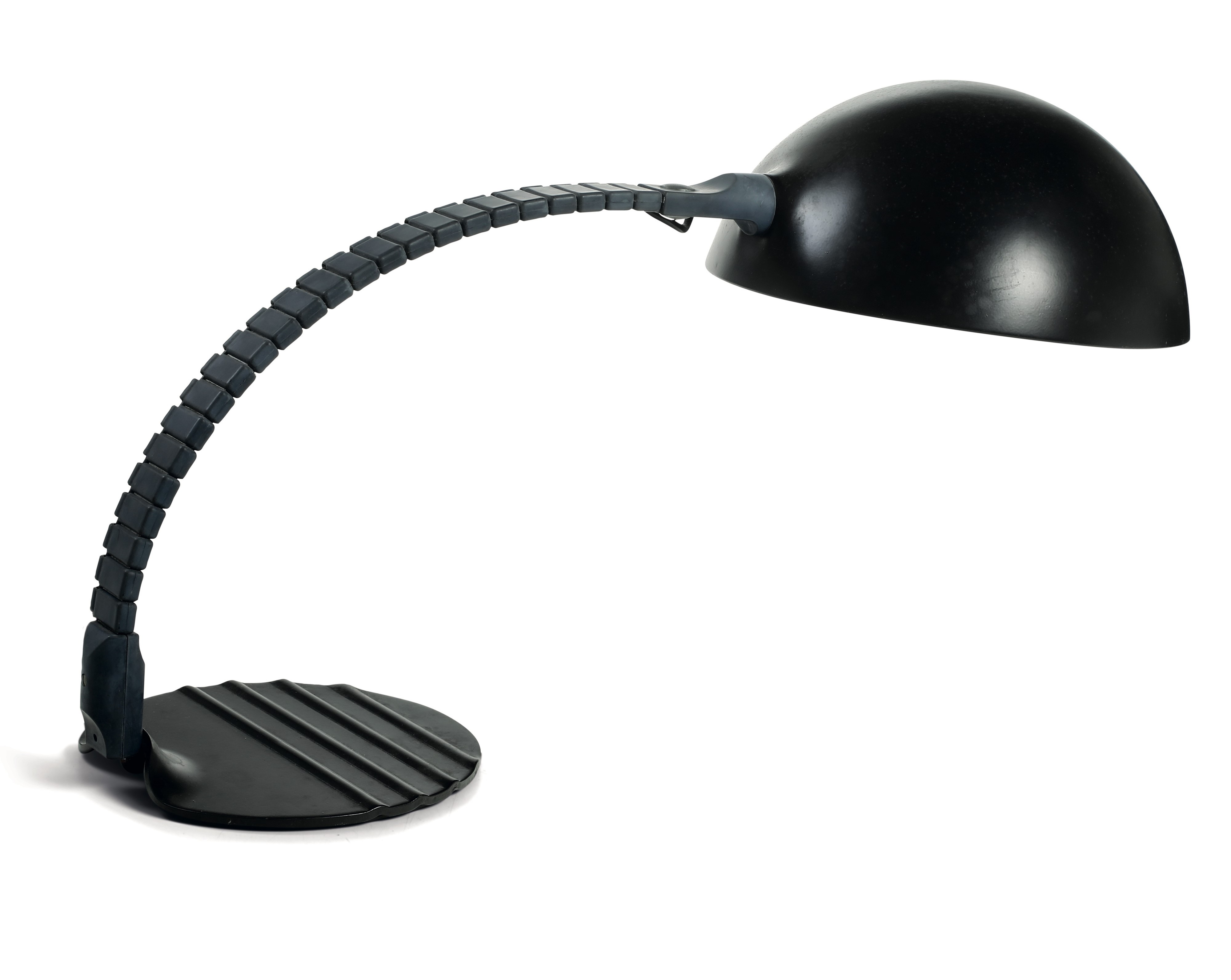 Lampada da tavolo con braccio flessibile e riflettore orientabile in resina. Base in metallo.