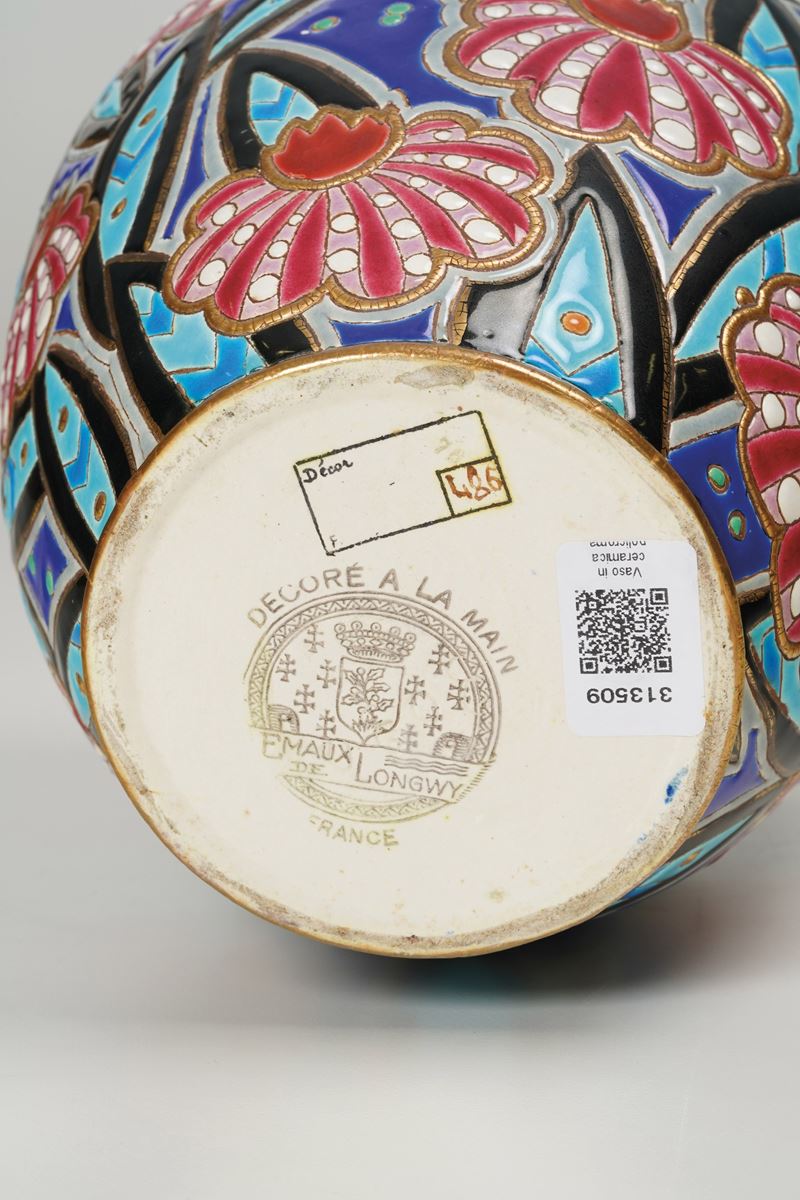 Vaso a bulbo in ceramica con decoro floreale stilizzato a smalti policromi e dorature a rilievo.