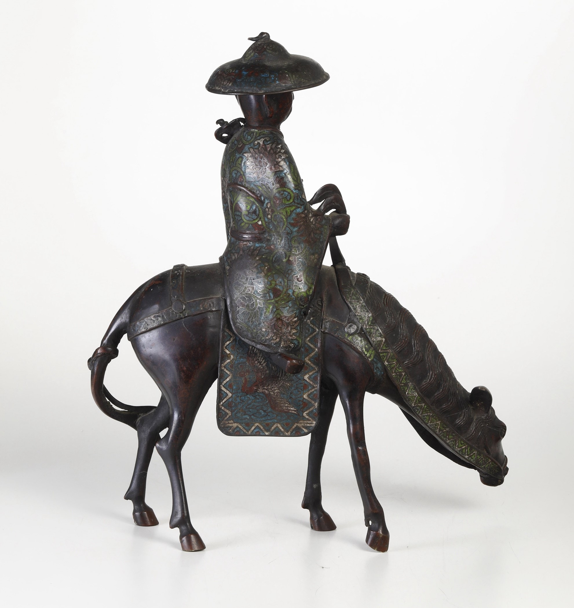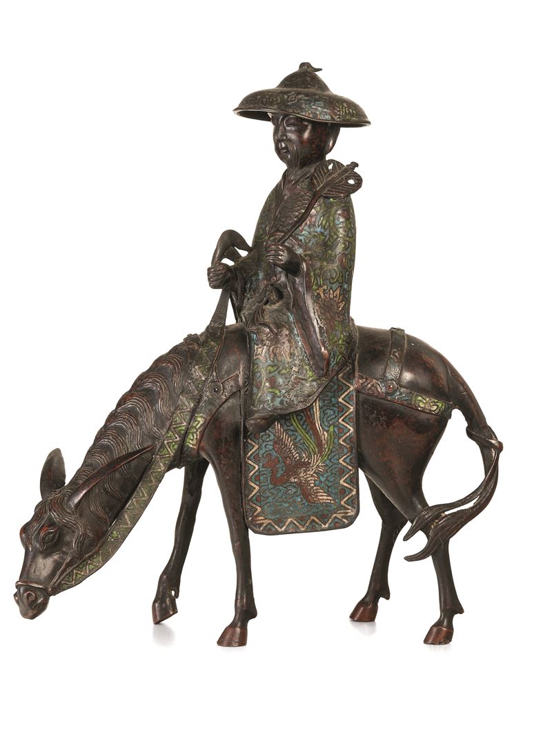 Figura di saggio che cavalca un mulo in smalto cloisonné, Giappone, XIX secolo