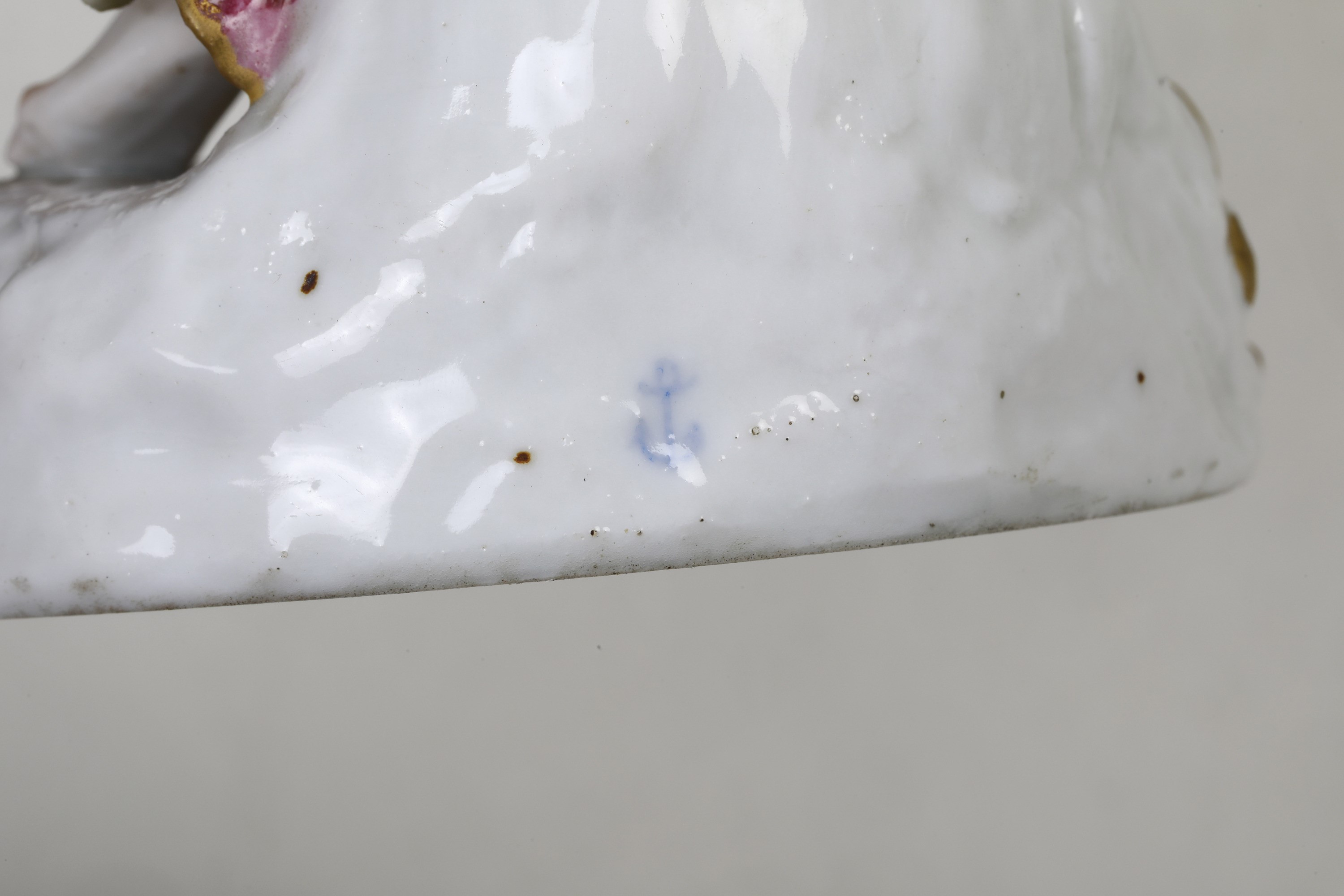Porcellana policroma e dorata. Marca: ancora in blu sulla base. Altezza cm 27,5. Conservazione: un avambraccio e una mano restaurati