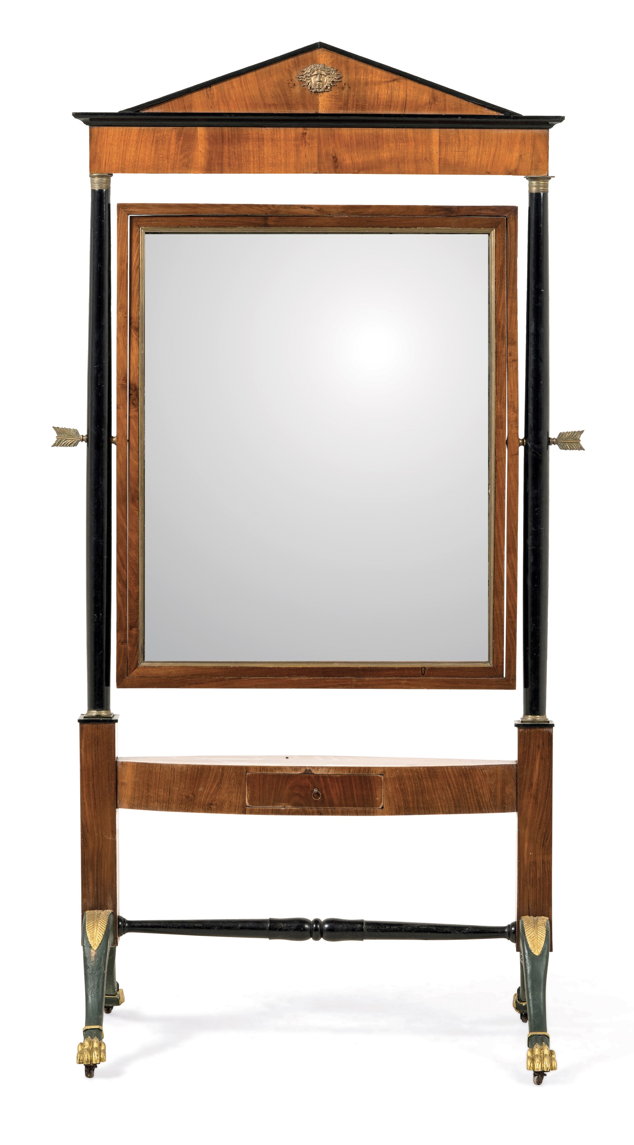 lastronata in mogano, colonne, base e profili in legno ebanizzato, capitelli e applicazioni in bronzo dorato, piedi ferini dorati, terminale a timpano con mascherone centrale