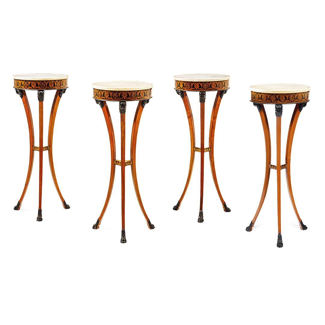 Gruppo di quattro gueridons lastronati e intarsiati. XIX secolo