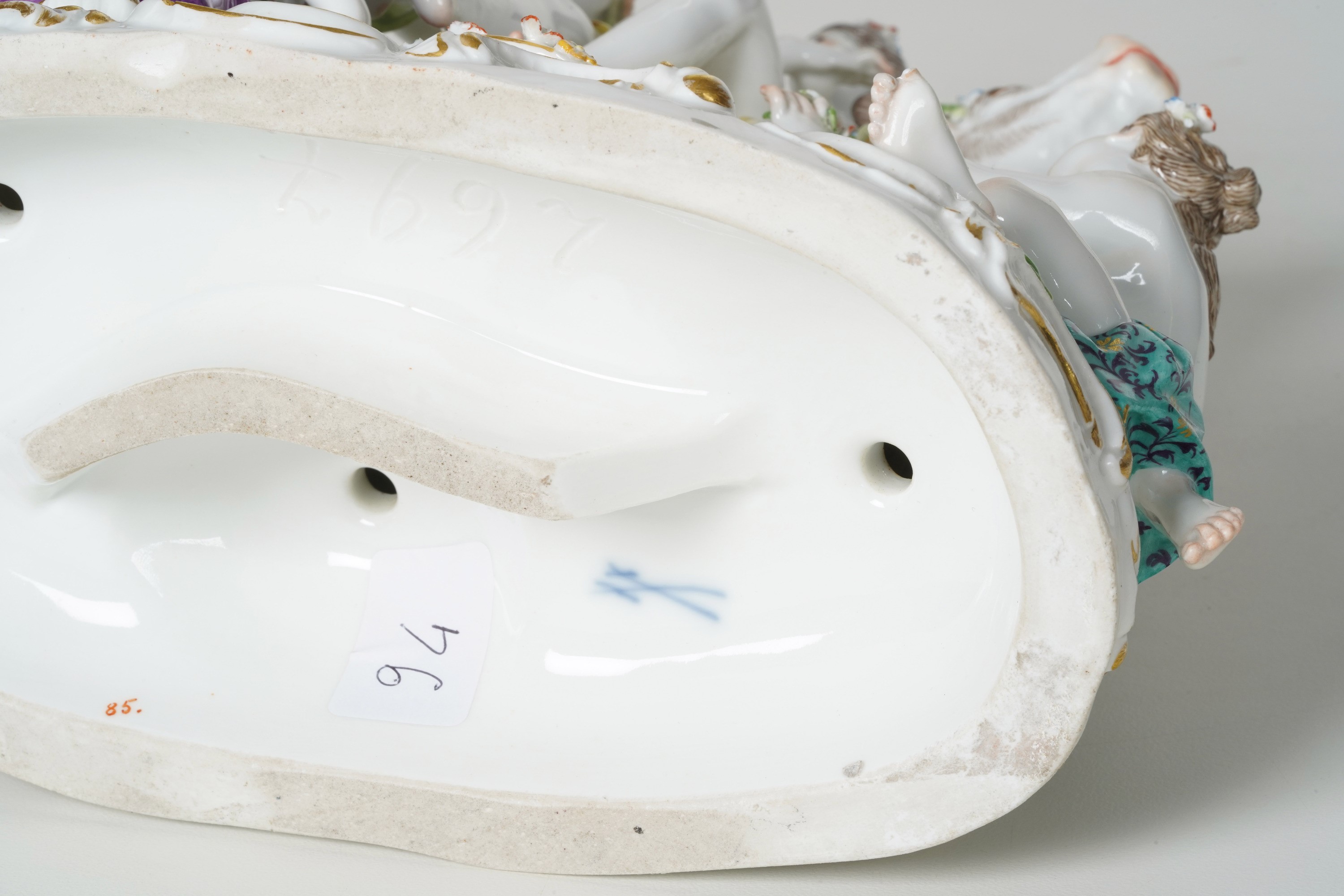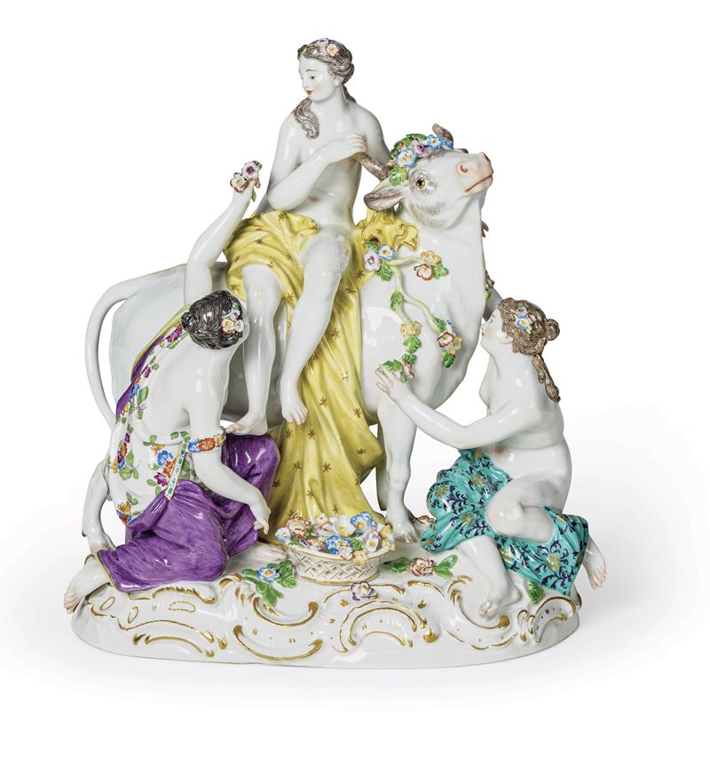 Questo gruppo è ripreso da un modello settecentesco attribuito al modellatore Friedrich Elias Meyer (1723-1785). Su zoccolo a zolla con rocailles lumeggiate in oro poggia il toro sul quale siede Europa seminuda avvolta da un lungo drappo e fiori nella capigliatura. Anche il toro è decorato con rami fioriti. Accando vi sono due ancelle nell’atto di offrire dei bouquets