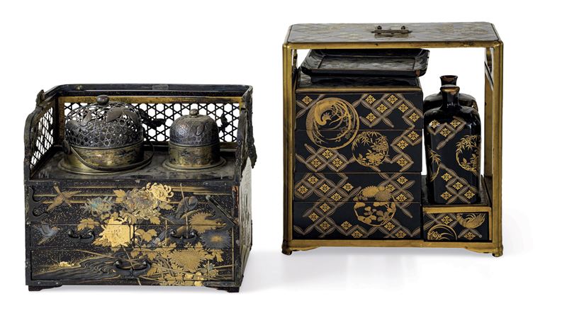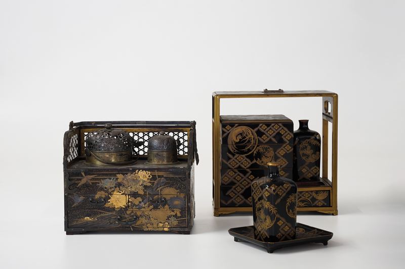 Lotto composto di due mobiletti da cerimonia in legno laccato e oro, Giappone, XX secolo