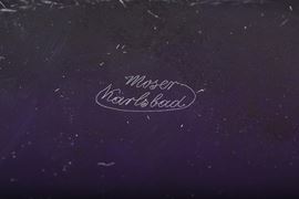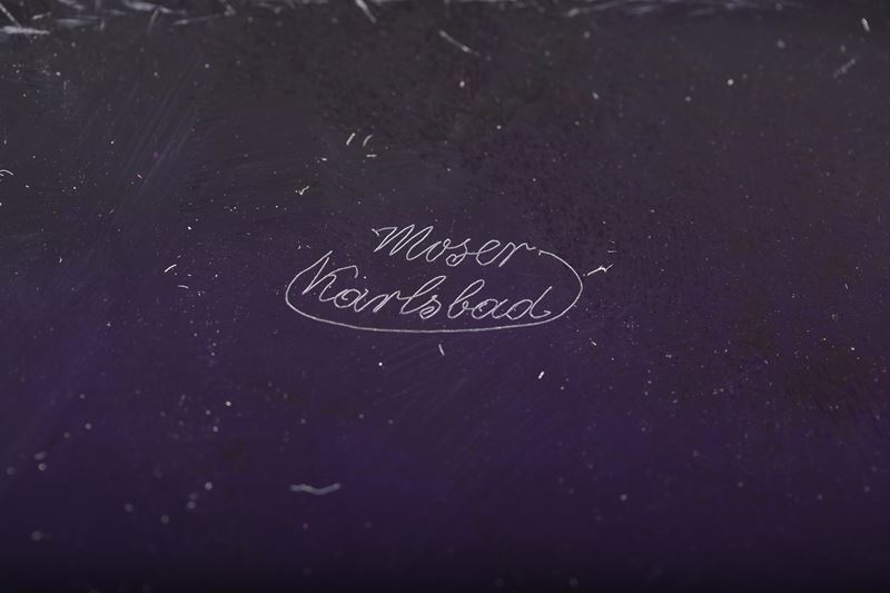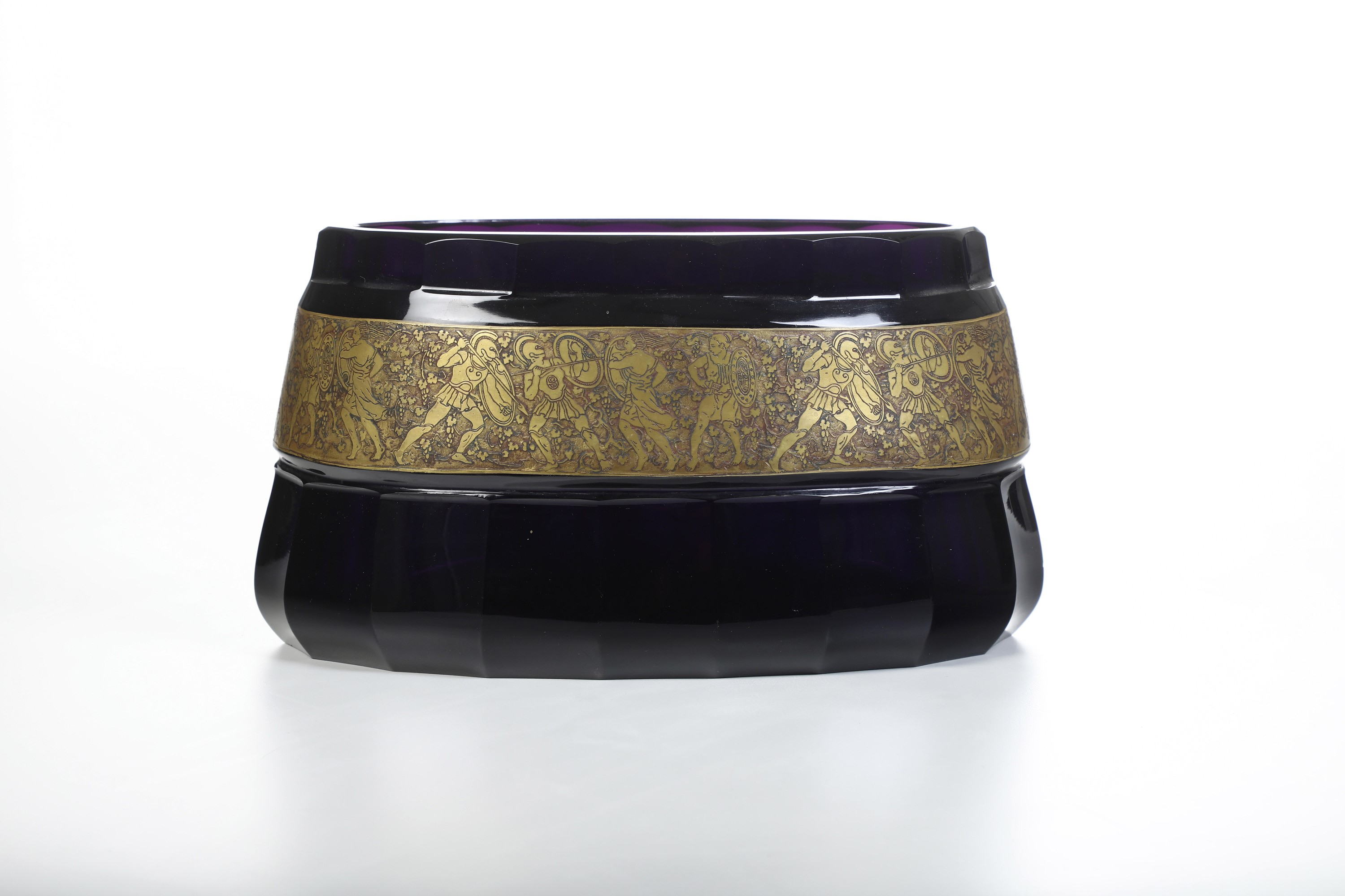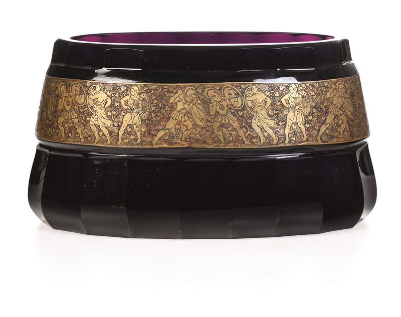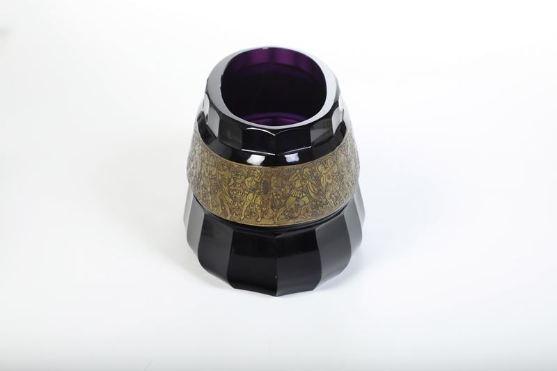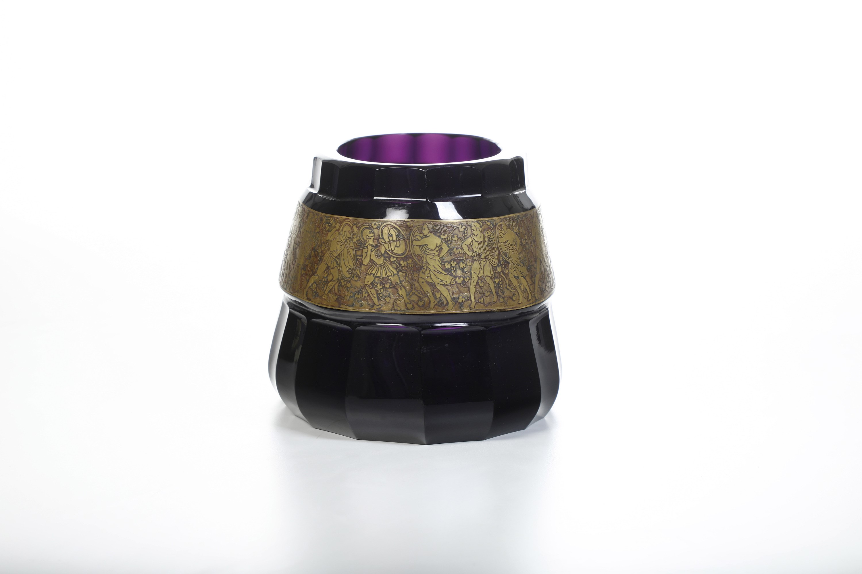Vaso troncoconico a sezione ovale in cristallo sfaccettato con fascia raffigurante fregio con personaggi mitologici in cammeo dorato.
