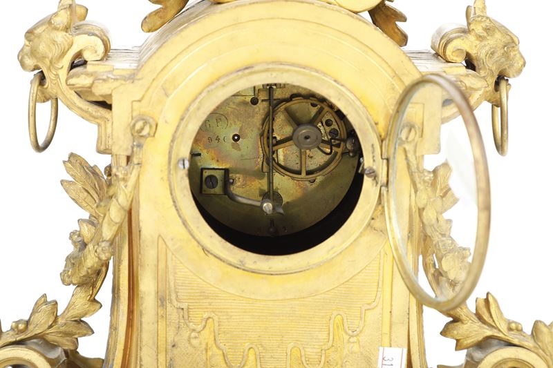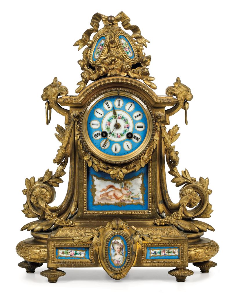 cassa in bronzo dorato arricchita da volute, festoni e teste di leone, inserti decorativi in porcellana policroma a fiori e amorini, cimasa decorata con fiocchi e placche in porcellana. Quadrante in porcellana con numeri romani e ghirlanda floreale policroma. Reca firma al retro della cassa "P.H. Mourey"