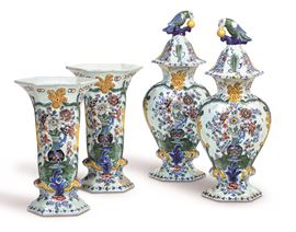 Le due potiches e i due vasi a tromba sono dipinti in policromia a gran fuoco con rocailles che incorniciano vasi con fiori d’ispirazione cinese ispirati alle maioliche Settecentesche di Delft