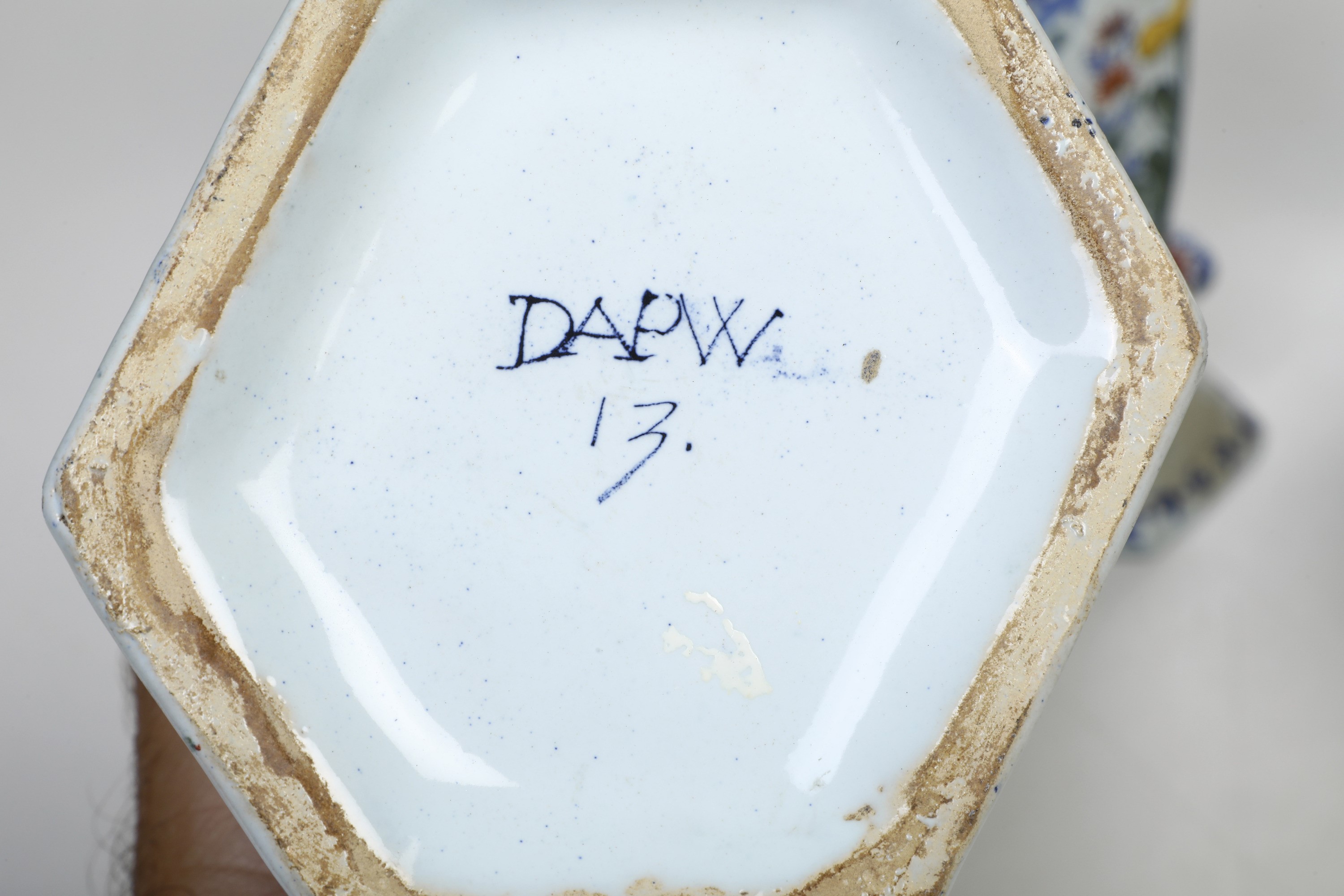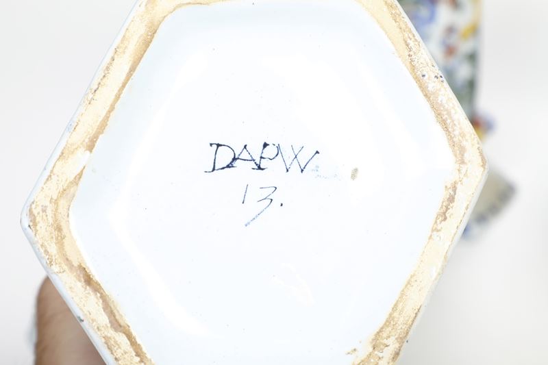Maiolica. Marca: “DAPW” e “13” in blu. Altezza massima cm 37,7. Conservazione: una potiche con rottura al piede incollata e sbeccature al bordo superiore, un coperchio con sbeccatura al bordo; i vasi a tromba con due minime sbeccature al bordo superiore