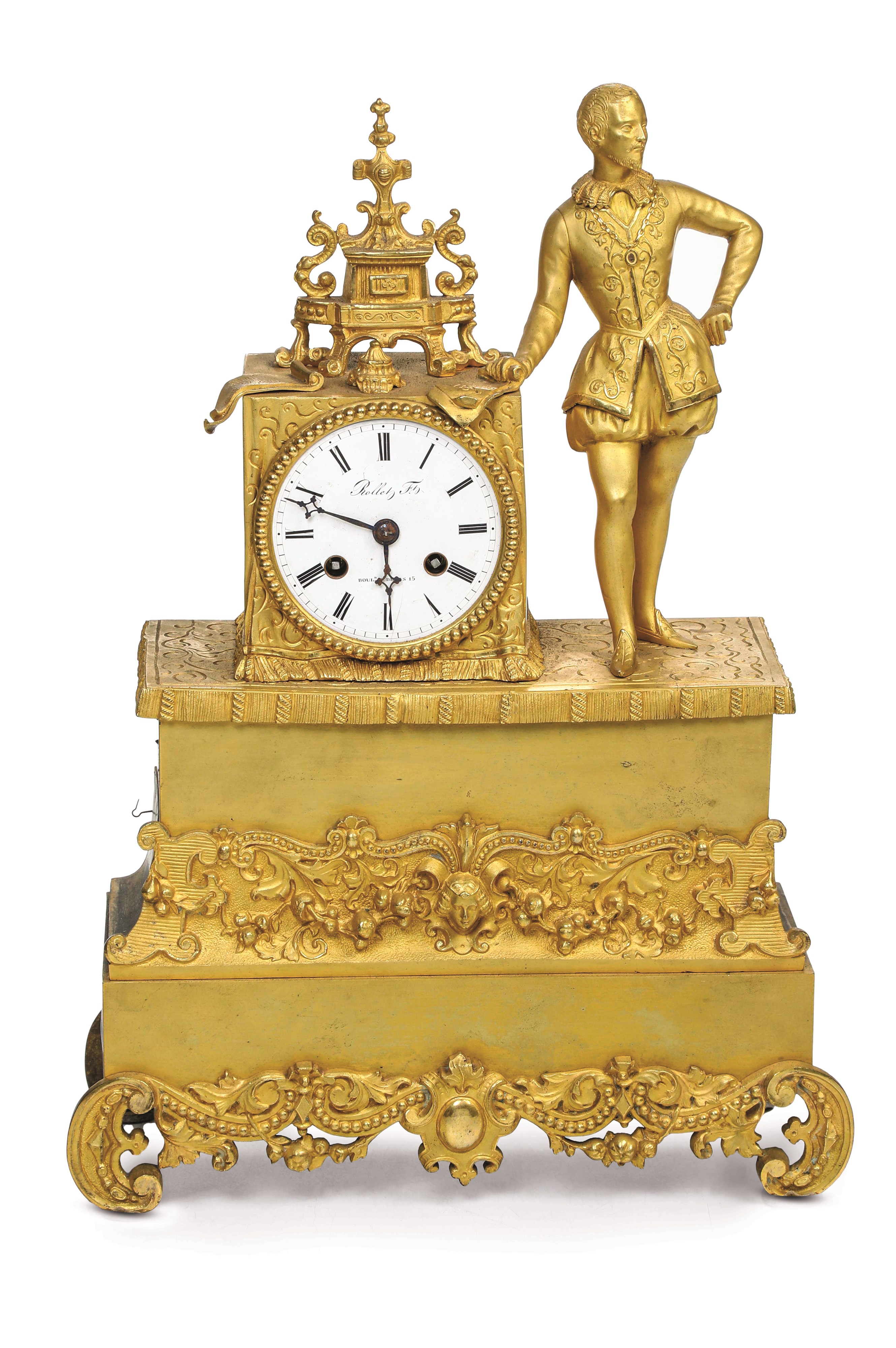 cassa in bronzo dorato con cimatura a urna e volute, cui è appoggiato un gentiluomo in abiti cinquecenteschi, base a gradini con decoro rocaille al fondo. Quadrante in smalto bianco con numeri romani; reca firma "Bolley Fr. Boul St. Denis 15"