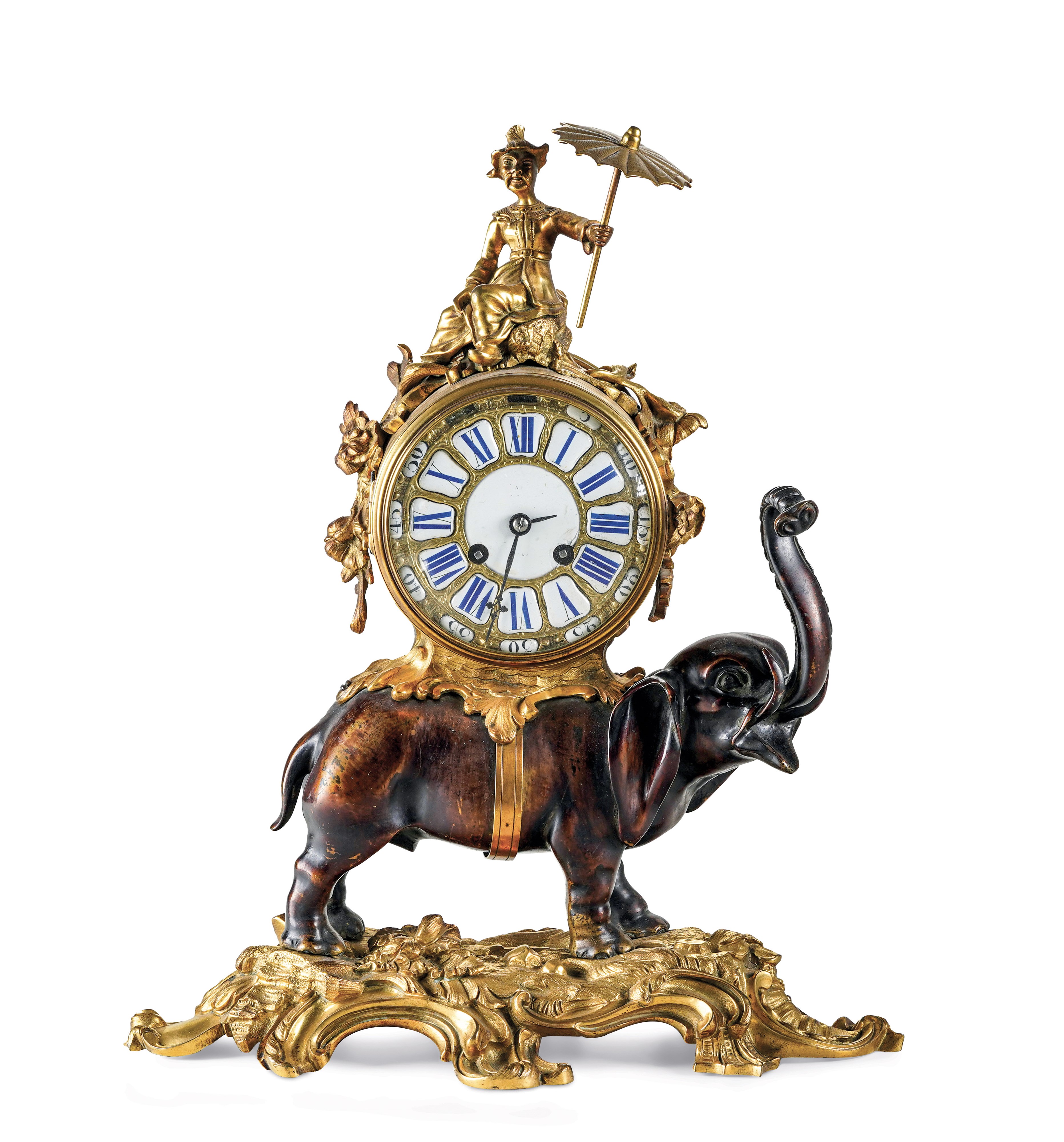 base rocaille su cui poggia un elefante con proboscide alzata che regge la cassa circolare, su cui siede un personaggio orientale. Quadrante a cartouches in smalto con numerazione romana per le ore ed araba per i minuti. Meccanismo firmato "R&C Paris&London Best Warranted" (mancanze)