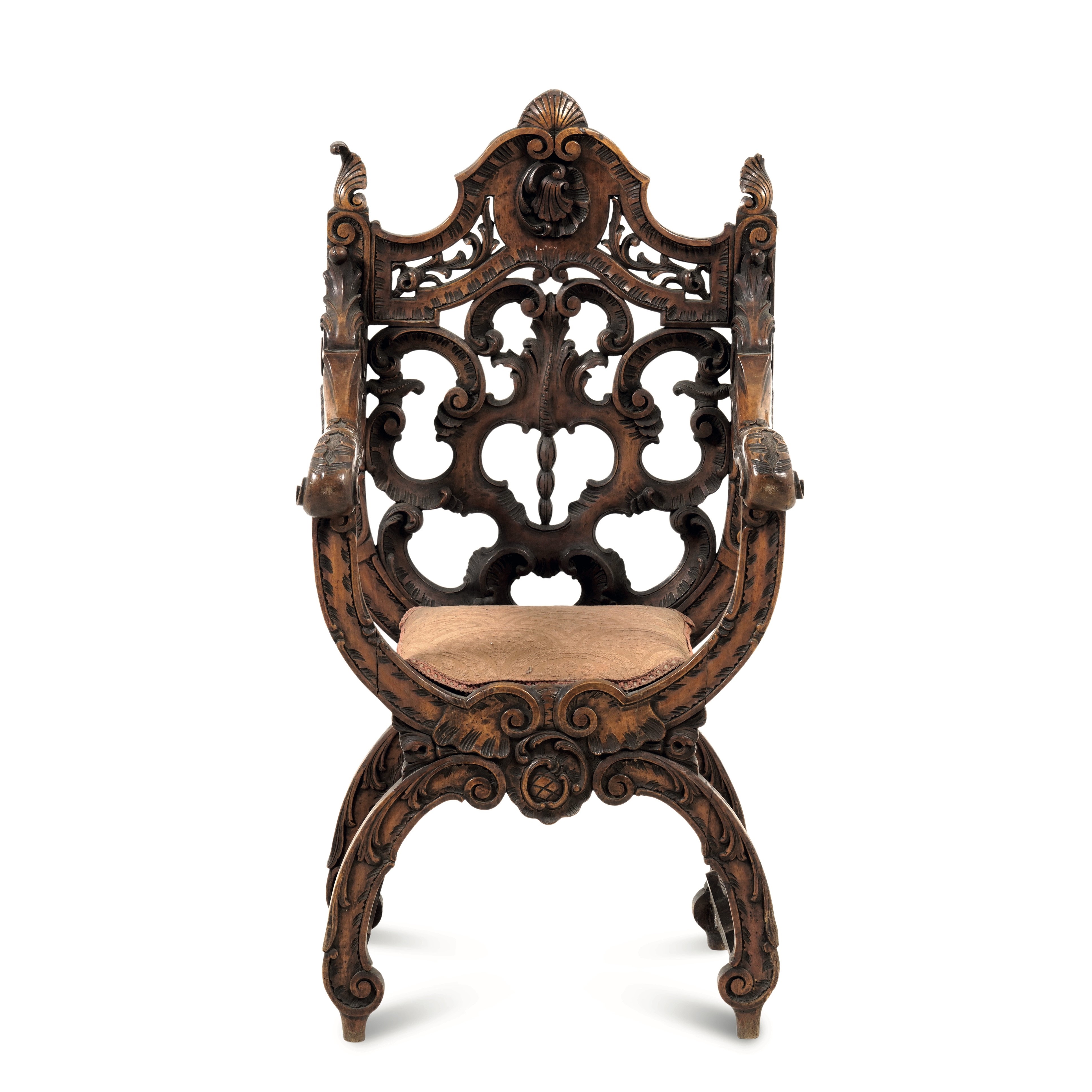 neomedievale, schienale traforato con decoro a conchiglie e motivi vegetali, seduta imbottita.