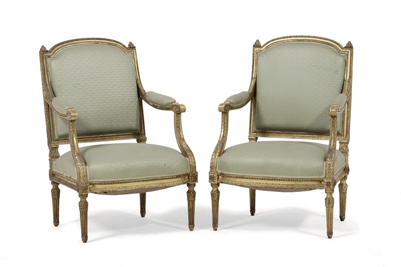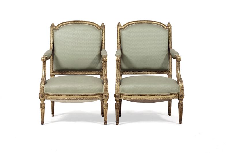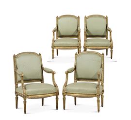 Quattro poltrone in legno intagliato e dorato. Francia, XVIII secolo
