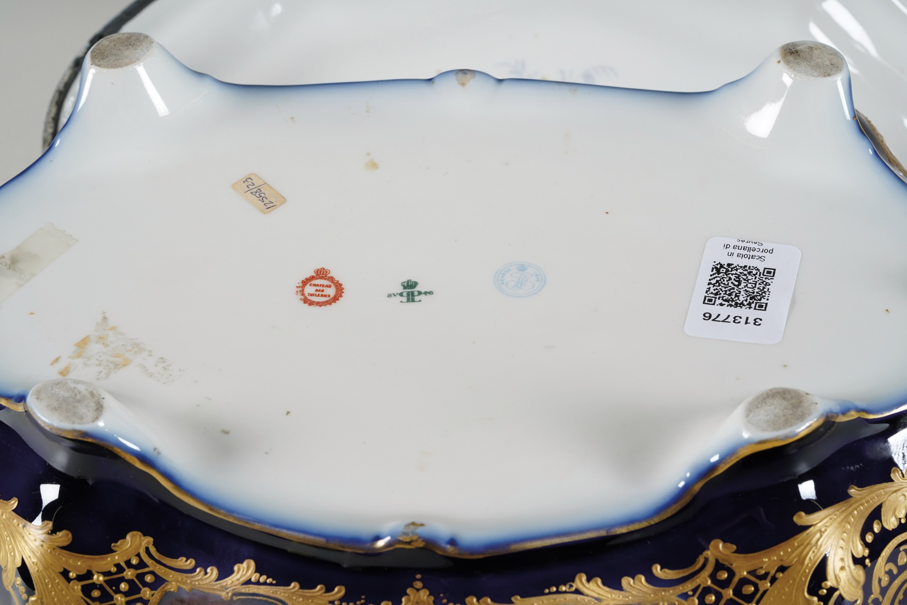 La grande scatola è decorata in policromia alla maniera di Sèvres con riserve di ispirazione settecentesca incorniciate da rocailles in oro su fondo blu
