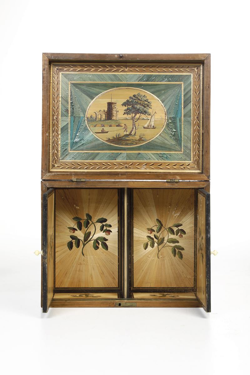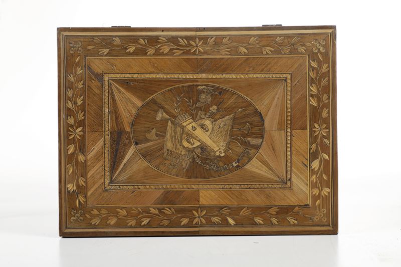 coperchio centrato da panoplia di strumenti musicali, fronte e lati decorati a girali vegetali, interno decorato con paesaggio e mazzi di fiori; diviso in due scomparti con sportellini