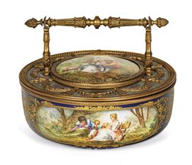 La scatola dal manico e montature in metallo dorato è decorata in policromia alla maniera di Sèvres con riserve di ispirazione settecentesca su fondo blu