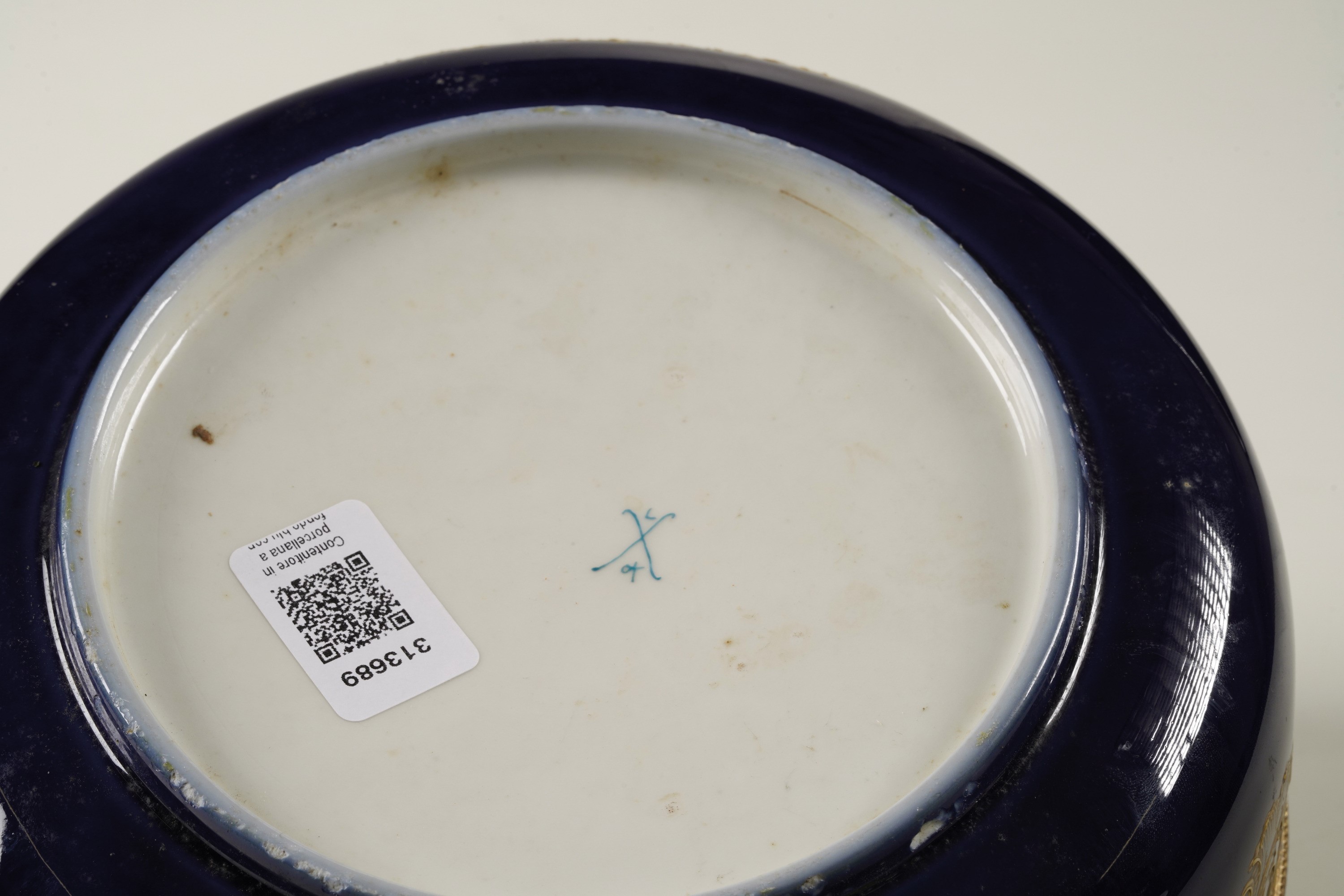 Porcellana. Marca: due tratti incrociati con lettere “L” “Ot (?)” in blu. Dimensioni: altezza cm 19; diametro cm 24. Conservazione: ottima; piccole sbeccature all’anello della base
