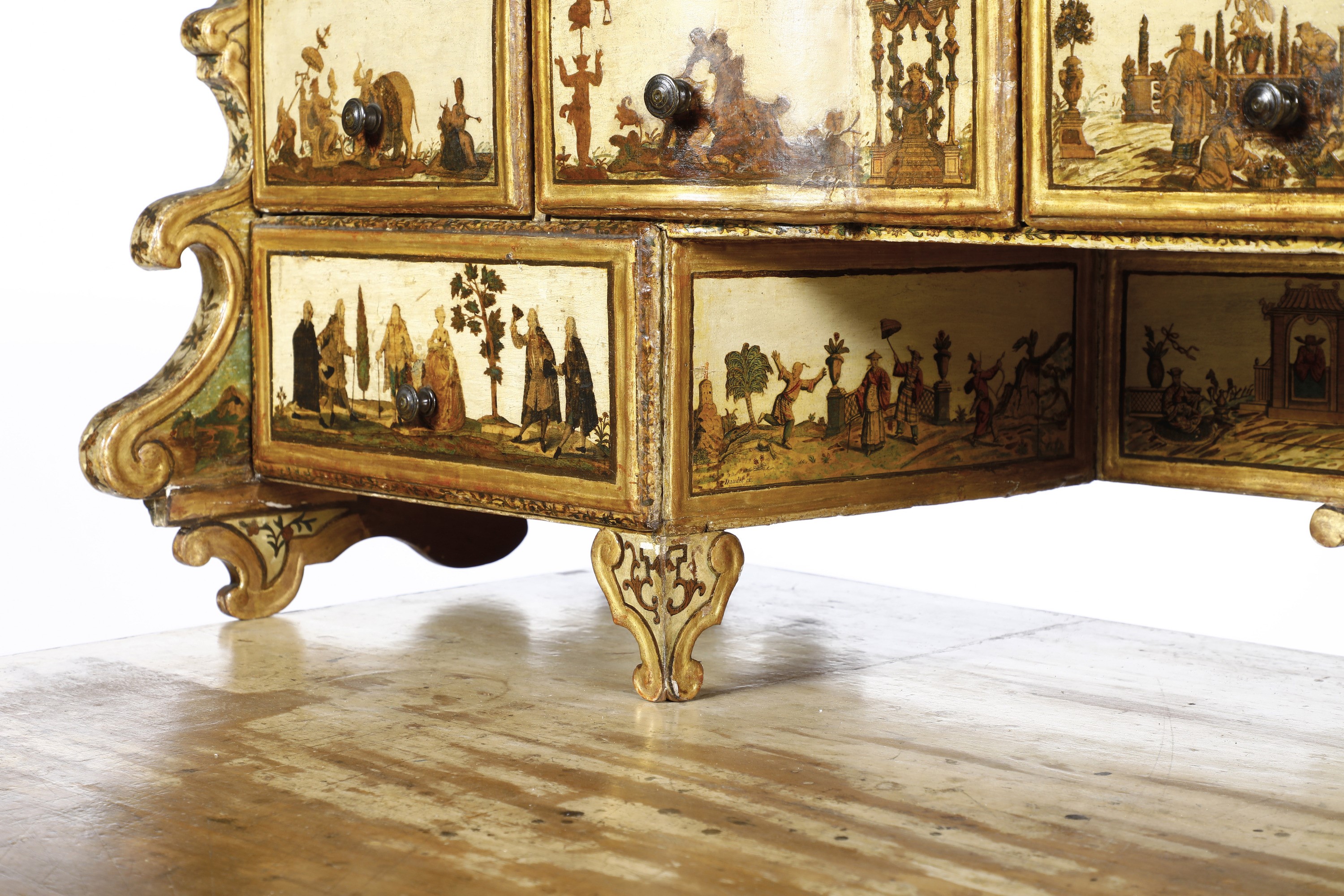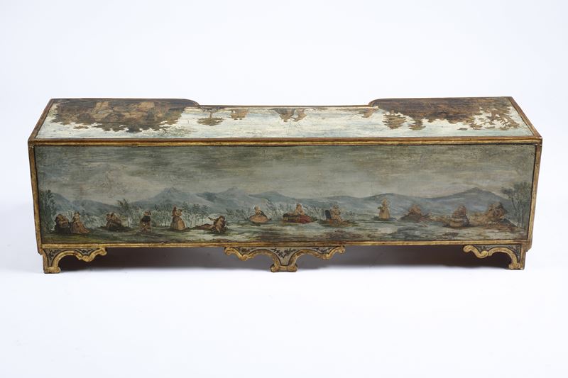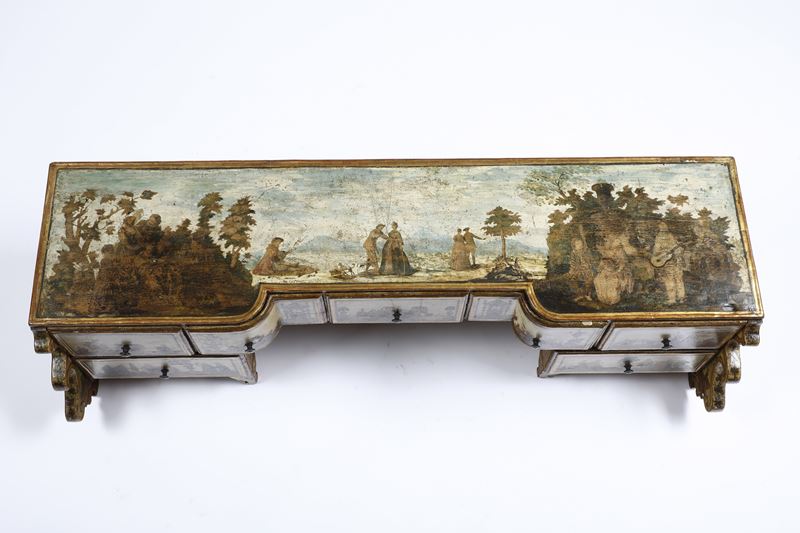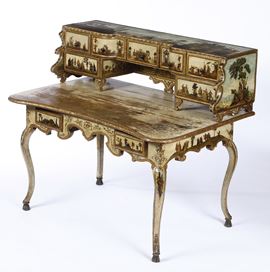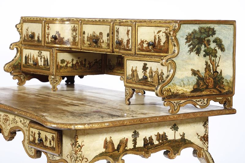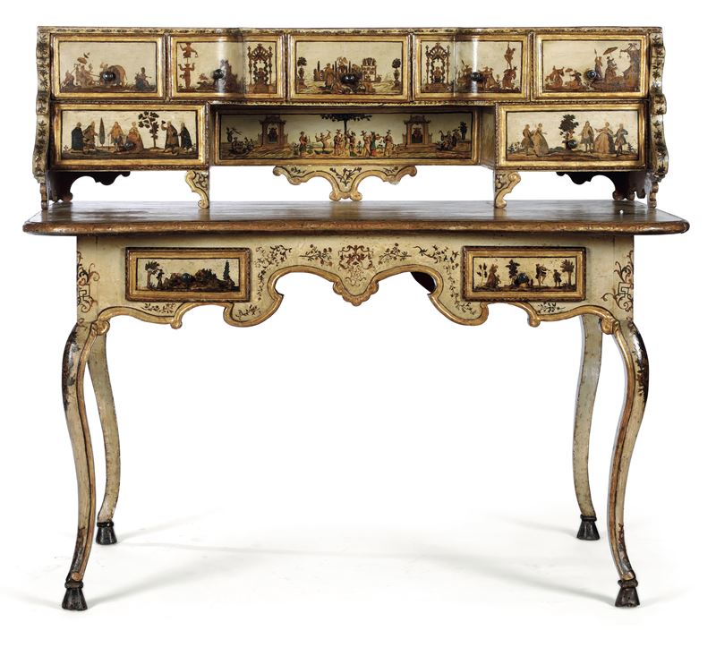 interamente laccato in policromia su fondo beige e ad arte povera con scene di corte, figurine orientali e scene galanti in paesaggi. Scrittoio a due cassetti, fascia e grembiale di linea spezzata, gambe mosse; alzata di forma sagomata con sette cassettini e montanti intagliati a ricciolo