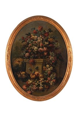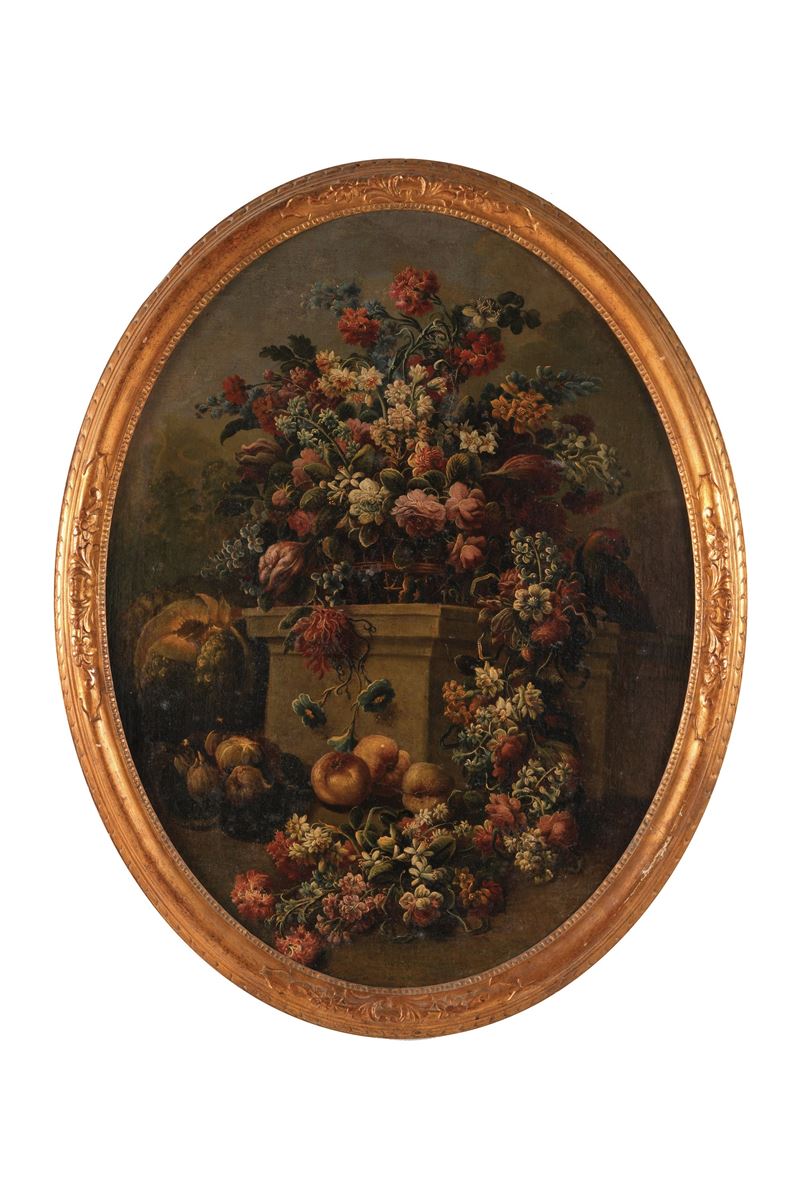 Scuola della fine del XVIII secolo Nature morte con composizioni di fiori e frutti in paesaggio