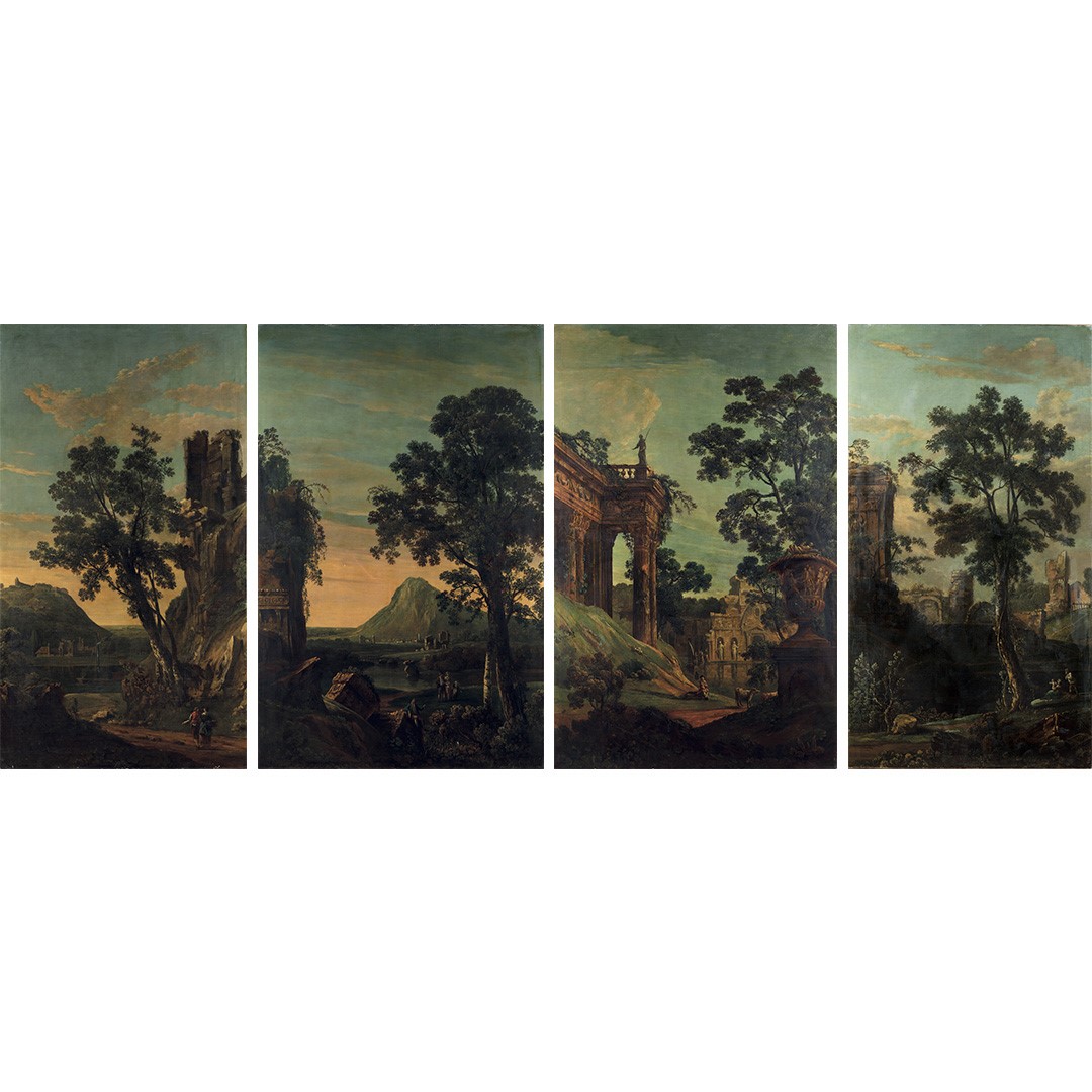 Scuola romana del XVIII secolo Paesaggi con architetture e figure