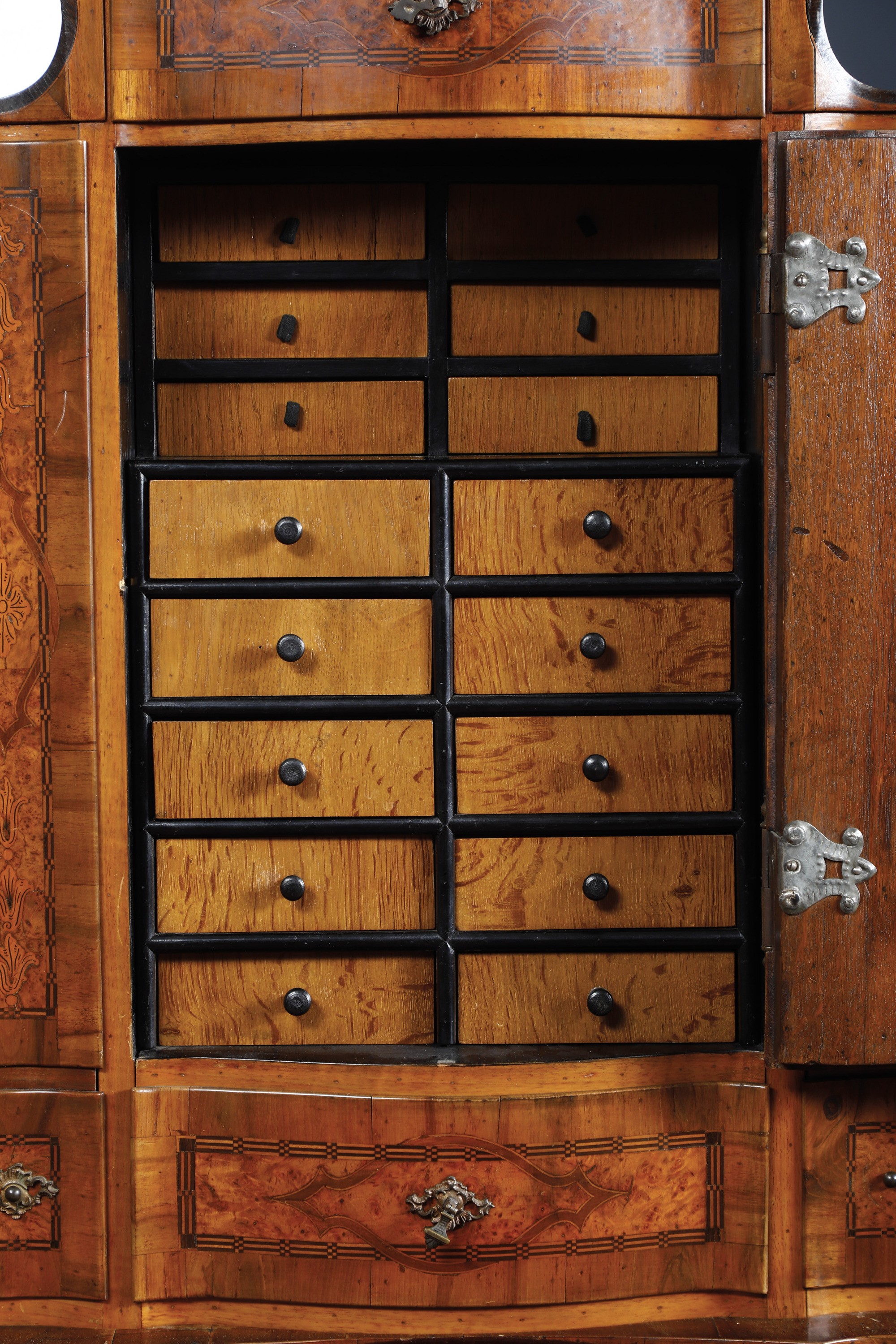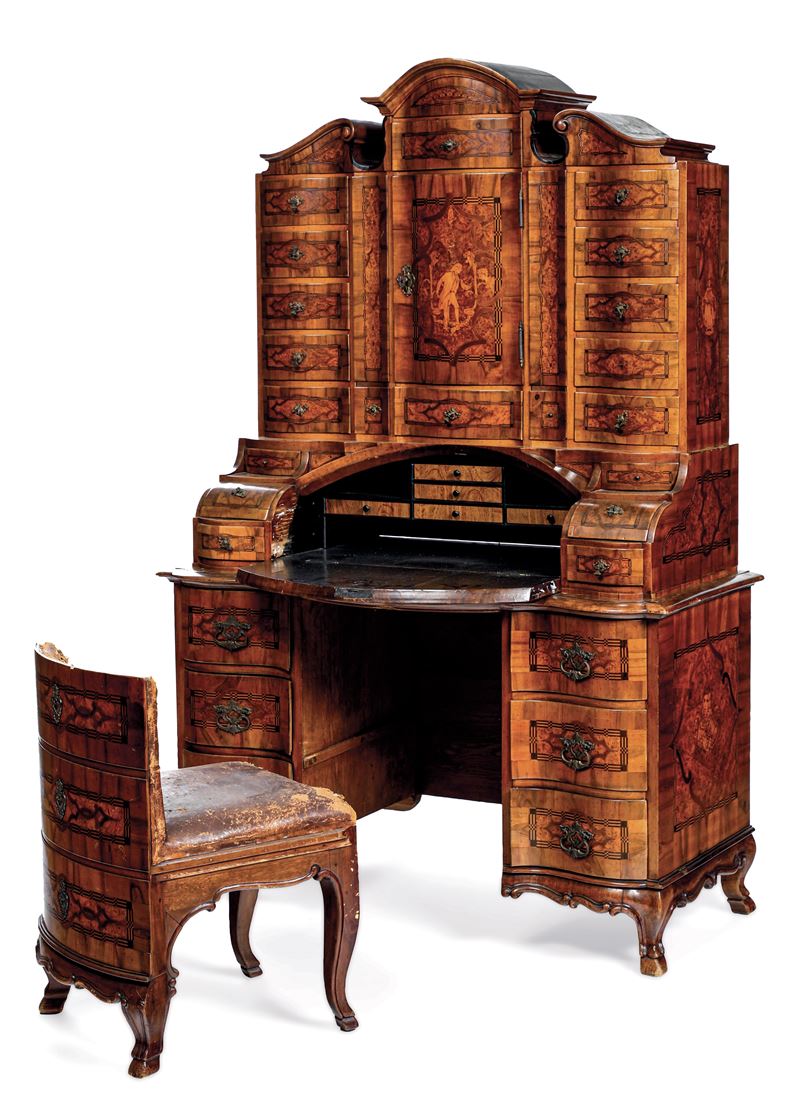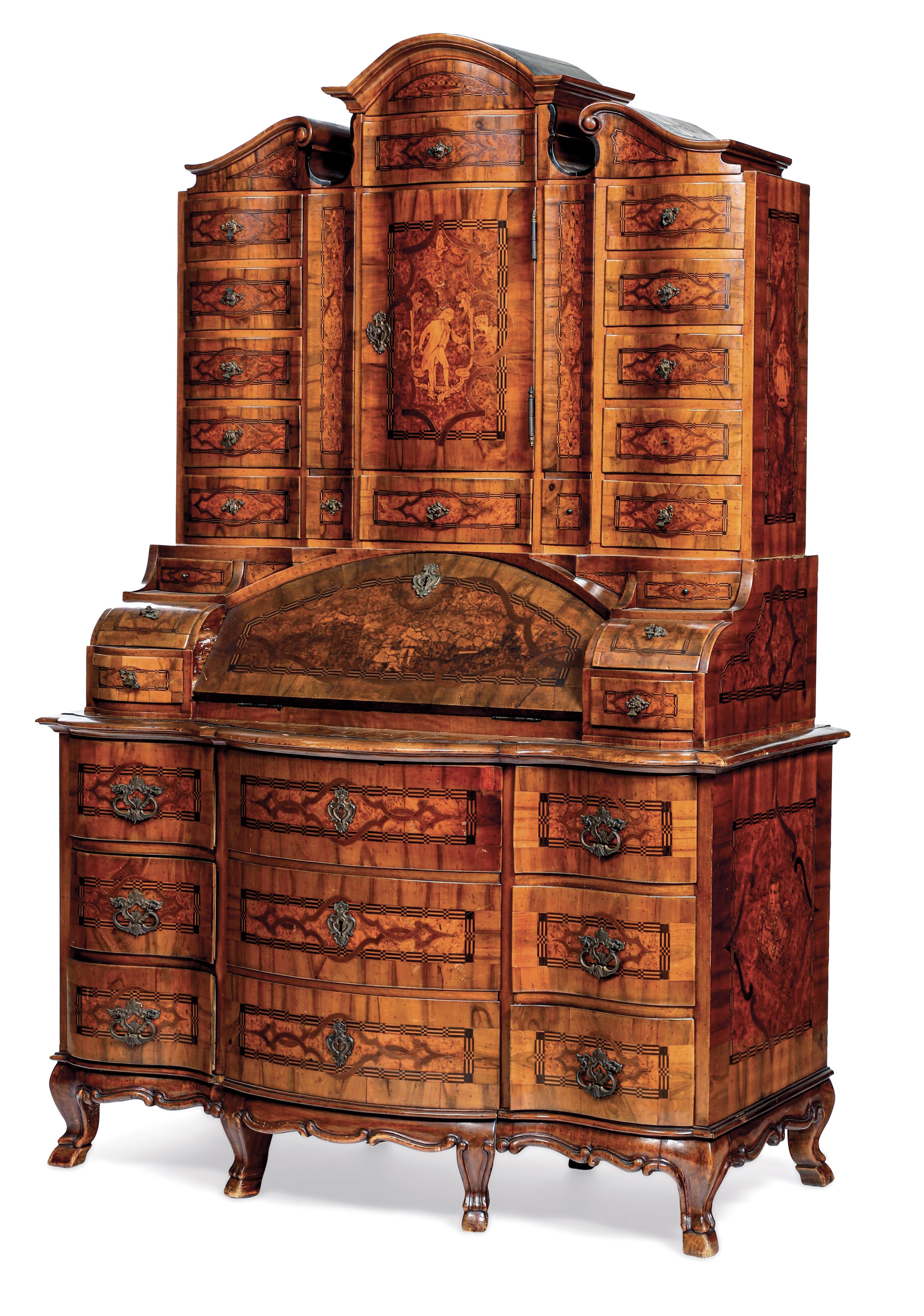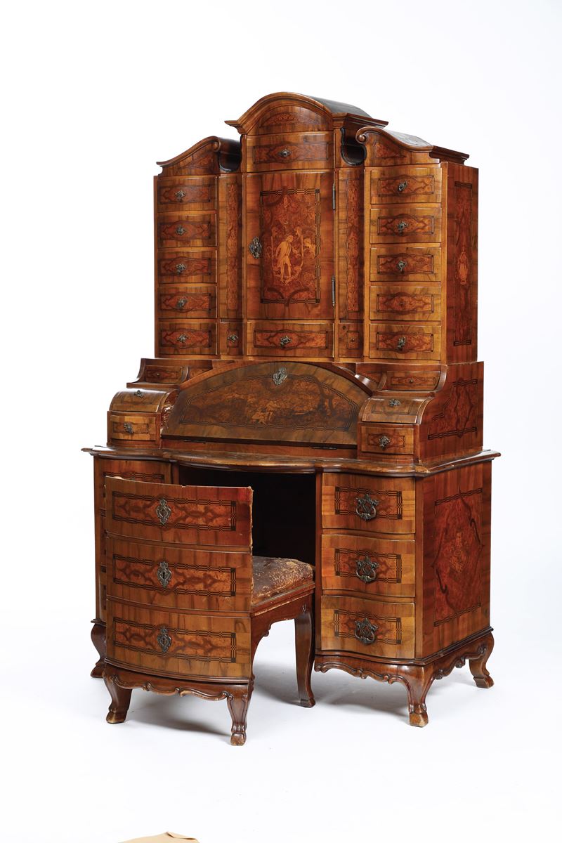 Secretaire con alzata lastronato ed intarsiato. Austria o Germania XVIII-XIX secolo