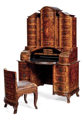 fronte e cappello mossi, cassettini laterali, seduta estraibile celata da finti cassetti, ribalta e sportello centrale decorati con scene di genere