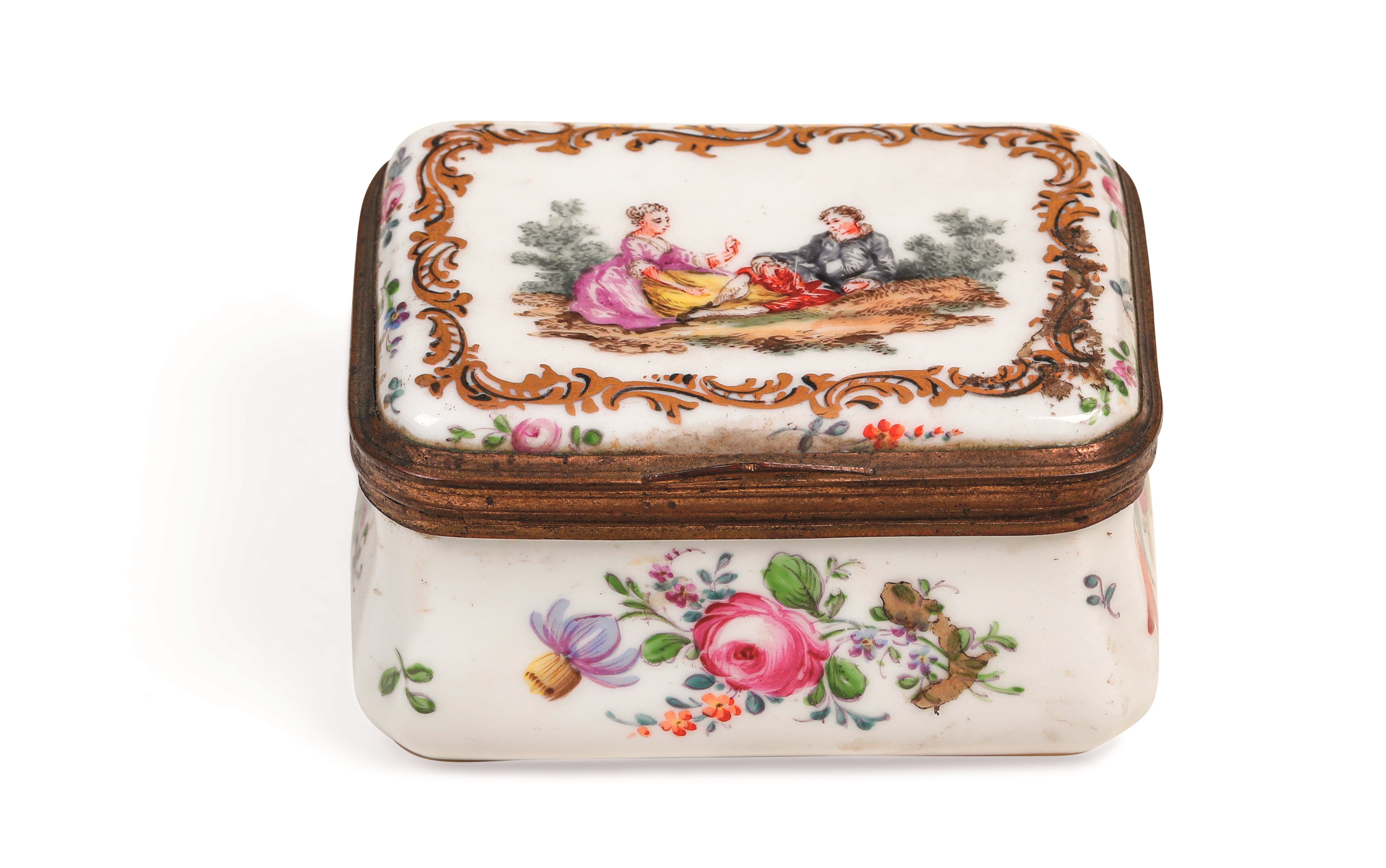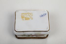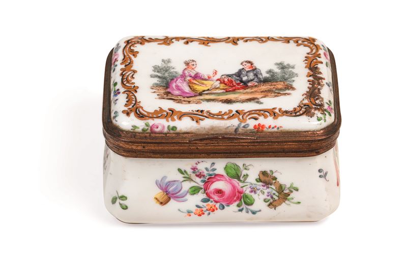 Porcellana, montatura in bronzo dorato. Marca: tre trattini incrociati e lettera “S” in blu. Dimensioni: altezza cm 4,5; cm 8,5x6,3. Conservazione: ottima; insignificante sbeccatura su uno spigolo al bordo superiore