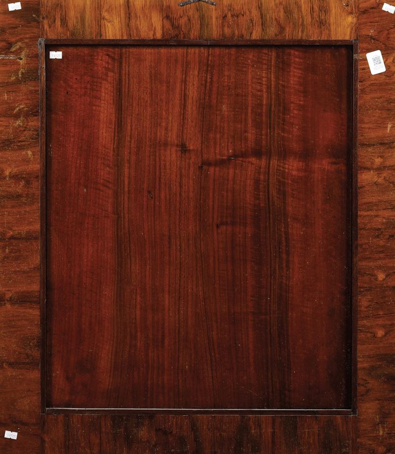Pannello in legno di noce intarsiato in mogano, bosso, ciliegio, acero, ebano, bois de violette e altri legni.