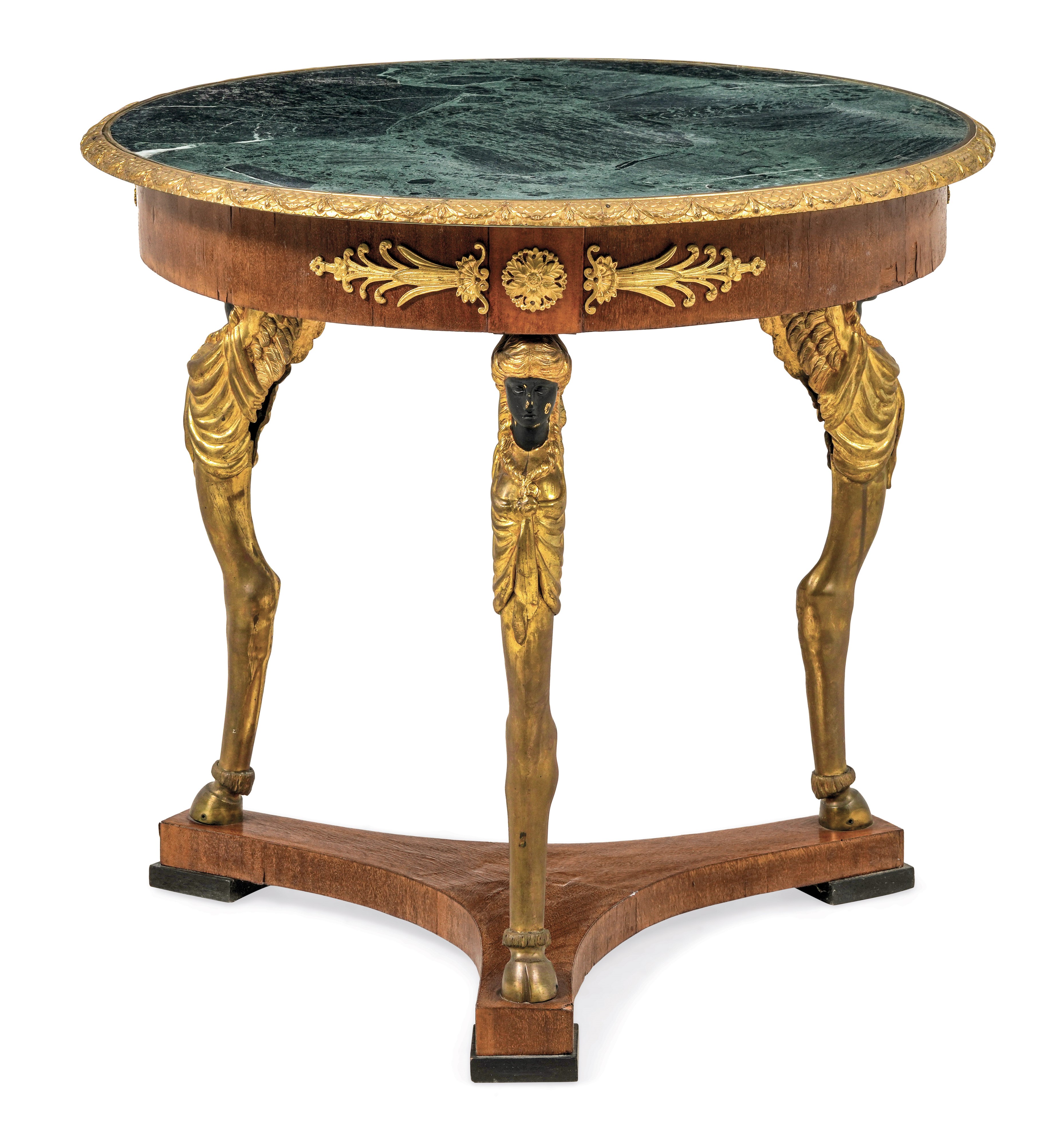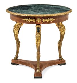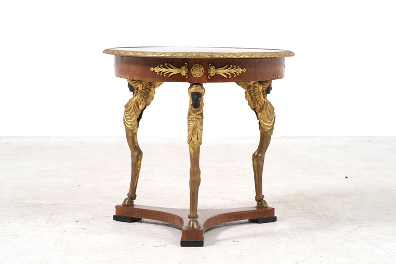 decori di gusto "Retour d'Egypte", gambe dorate in forma di figure alate con piede a zoccolo, piano circolare in marmo verde