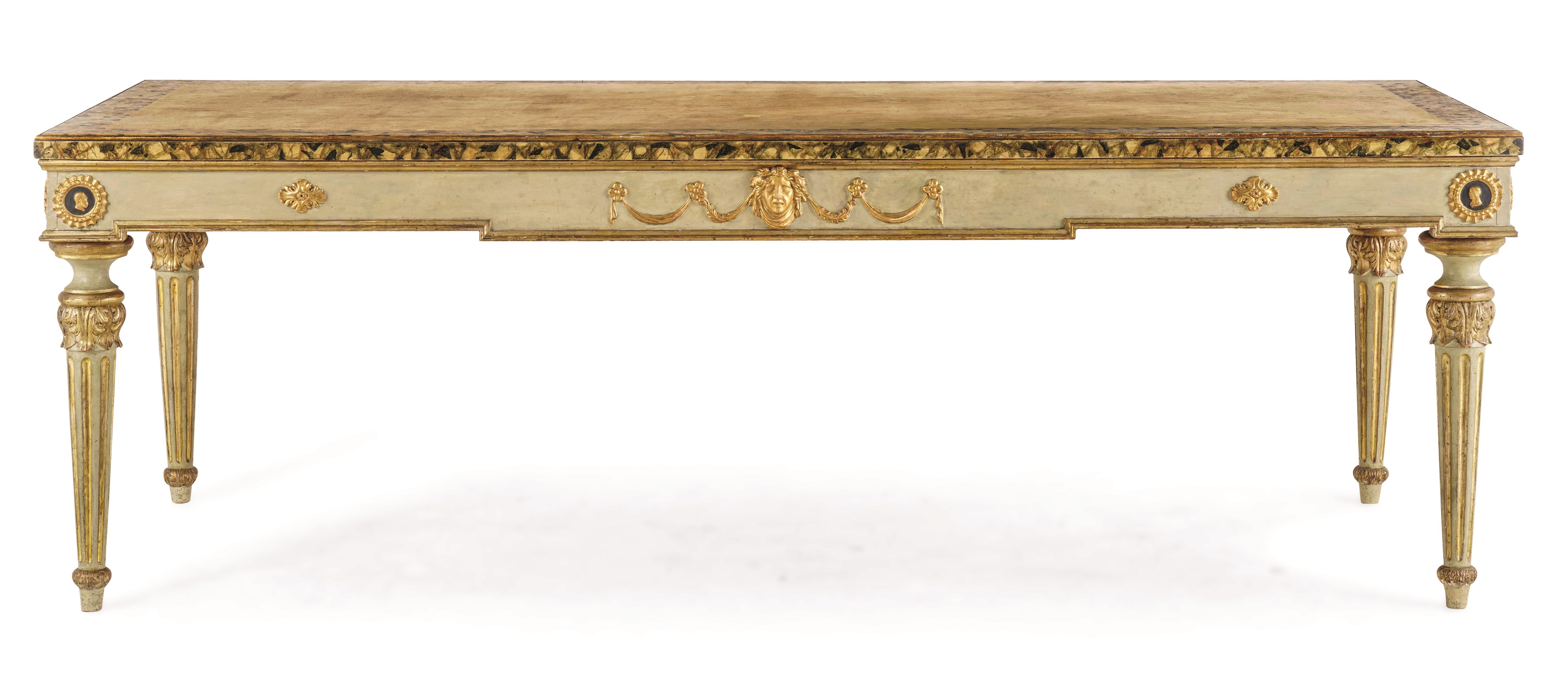 fascia arricchita da festoni, mascheroni e riserve con profili, piano dipinto a finto marmo, gambe troncoconiche scanalate