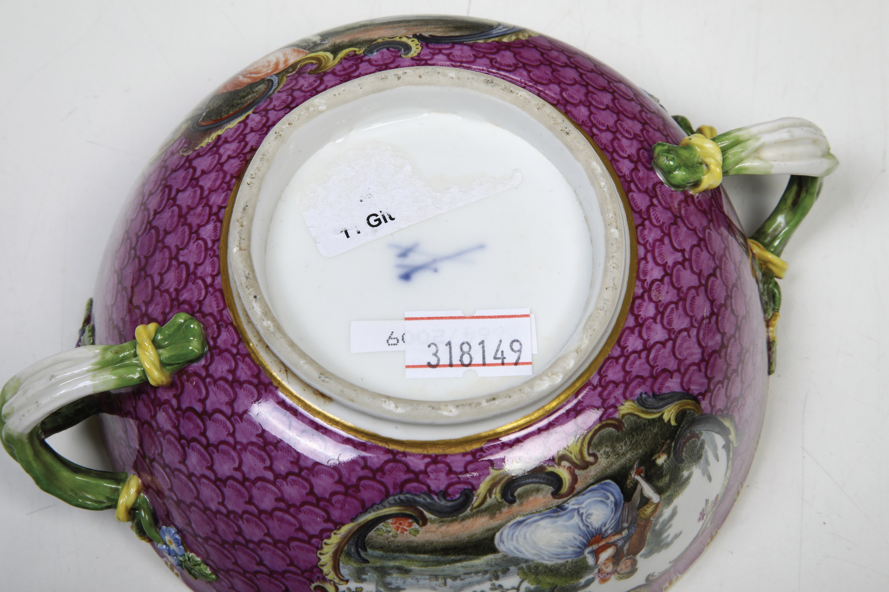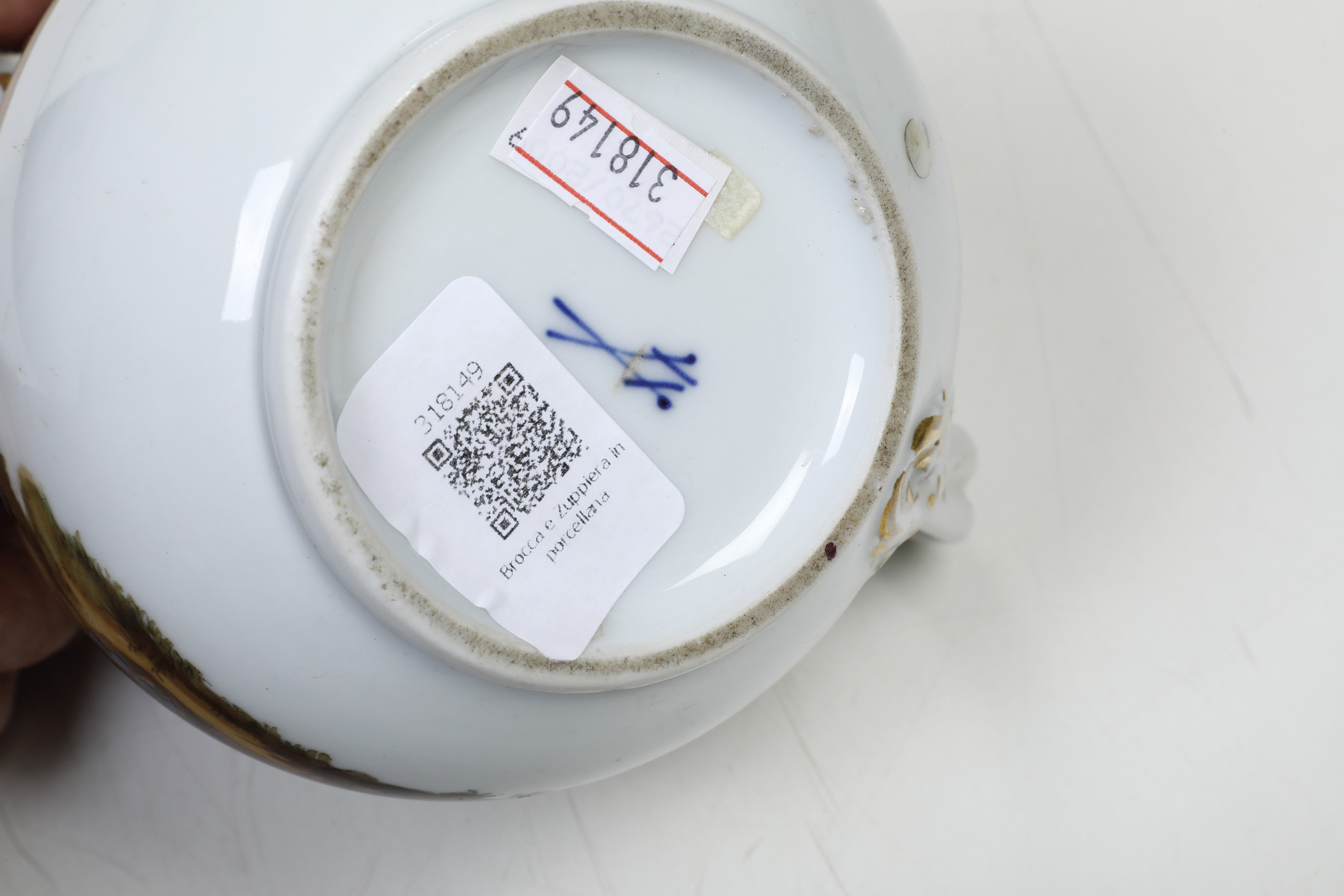 Porcellana. Marca: spade incrociate in blu. Dimensioni: cioccolatiera altezza cm 19; tazza da brodo altezza cm 6; diametro cm 12,5. Conservazione: ottima; insignificante sbeccatura restaurata al coperchio della tazza da brodo