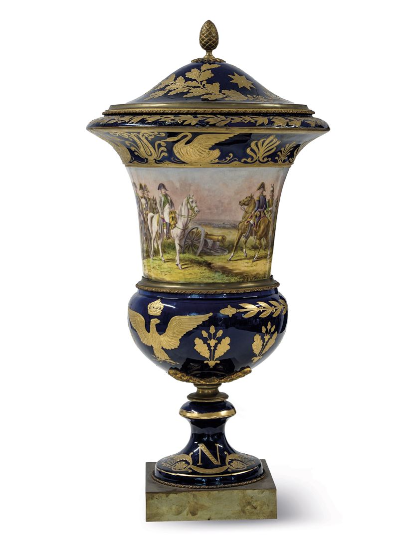 Vaso con coperchio decorato con una riserva a scene napoleoniche policrome con ufficiali e soldati a cavallo. Elementi vegetali e simbolici napoleonici sono tracciati a rilievo in oro sul resto della superficie dal fondo blu