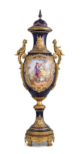 Porcellana e bronzo dorato. Marca: pseudo marca di Sèvres. Altezza cm 98. Conservazione: piccola mancanza al collo; coperchio di rimpiazzo