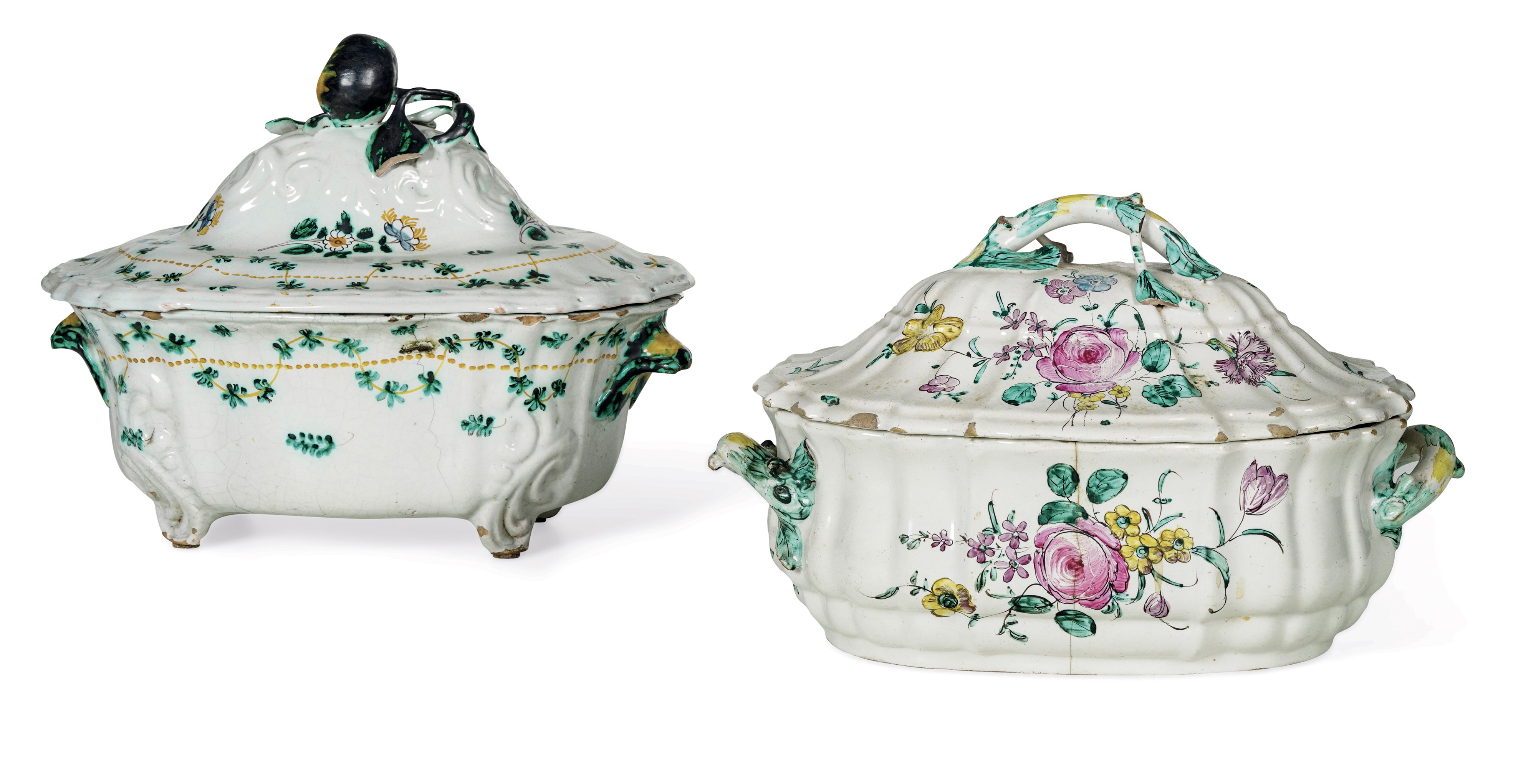 Al lotto si aggiunge una zuppiera del XIX-XX secolo (altezza cm 21; cm 33x21; felature e sbeccature)