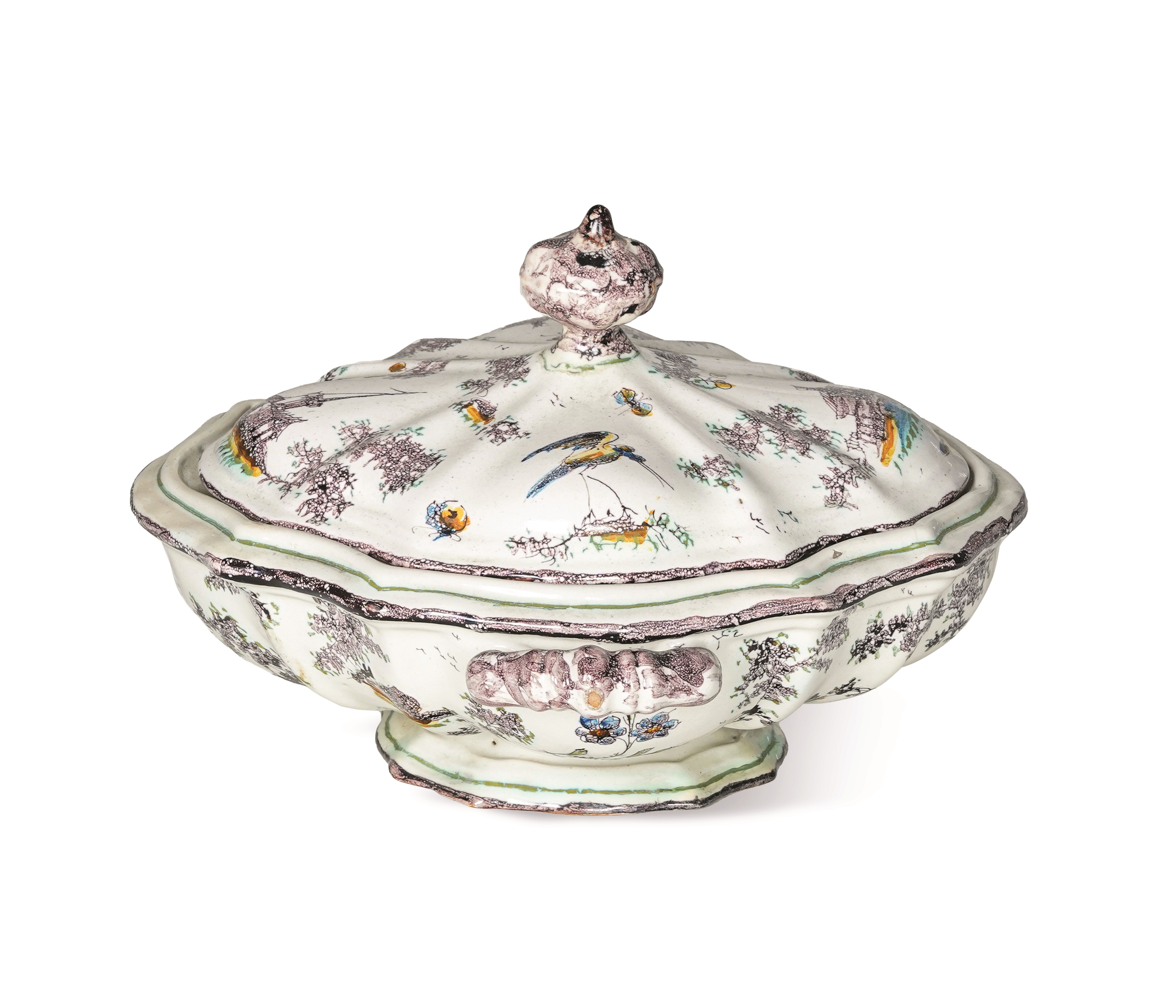 Maiolica. Marca: assente. Dimensioni: altezza cm 13; cm 24x26x5. Conservazione: ottima; felatura passante al corpo; piccole tracce di restauro al piede
