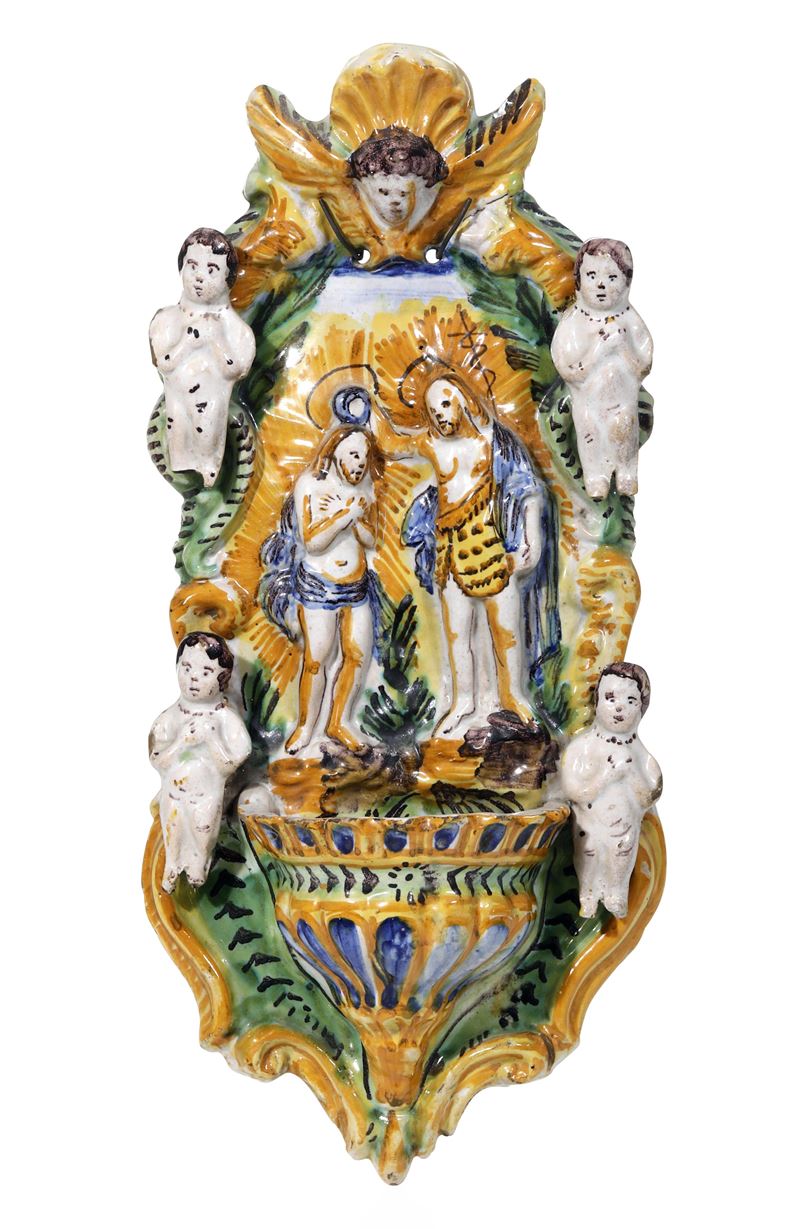 L’acquasantiera, decorata a rilevo con la scena del Battesimo di Cristo da parte di Giovanni Battista affiancata da quattro putti, é dipinta in policromia a gran fuoco in ocra, giallo, verde, blu e manganese. La cimasa è modellata a testa di cherubino e la vaschetta baccellata