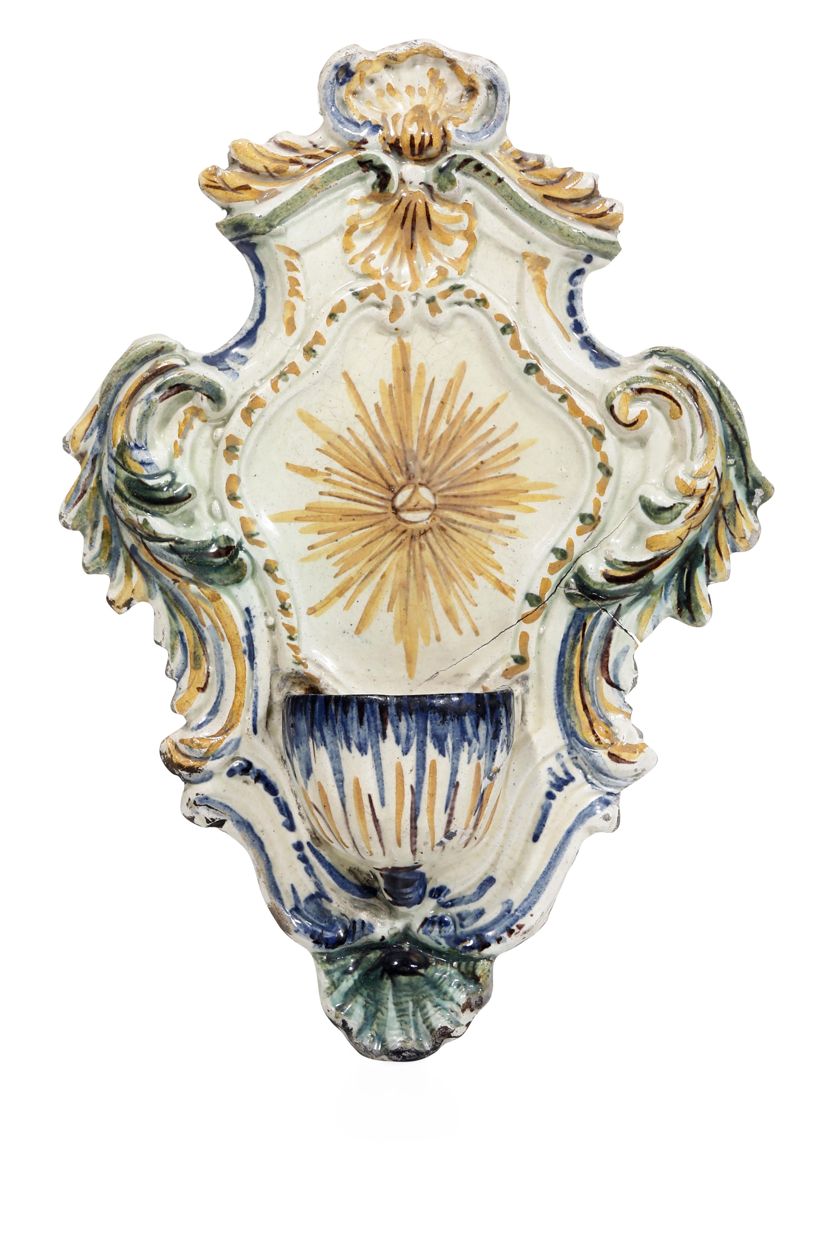 Maiolica policroma. Marca: assente. Altezza cm 30. Conservazione: due felature; rocaille inferiore rotta in due frammenti e incollata; usure e mancanze minori