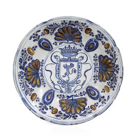 La profonda coppa è decorata con baccellature a rilievo di ispirazione ispano-moresca, quattro a forma di ovuli e quattro a fiore a mo’ di conchiglia, dipinte in ocra, manganese e turchino da cui si dipartono racemi. Al centro grande stemma araldico con leone rampante