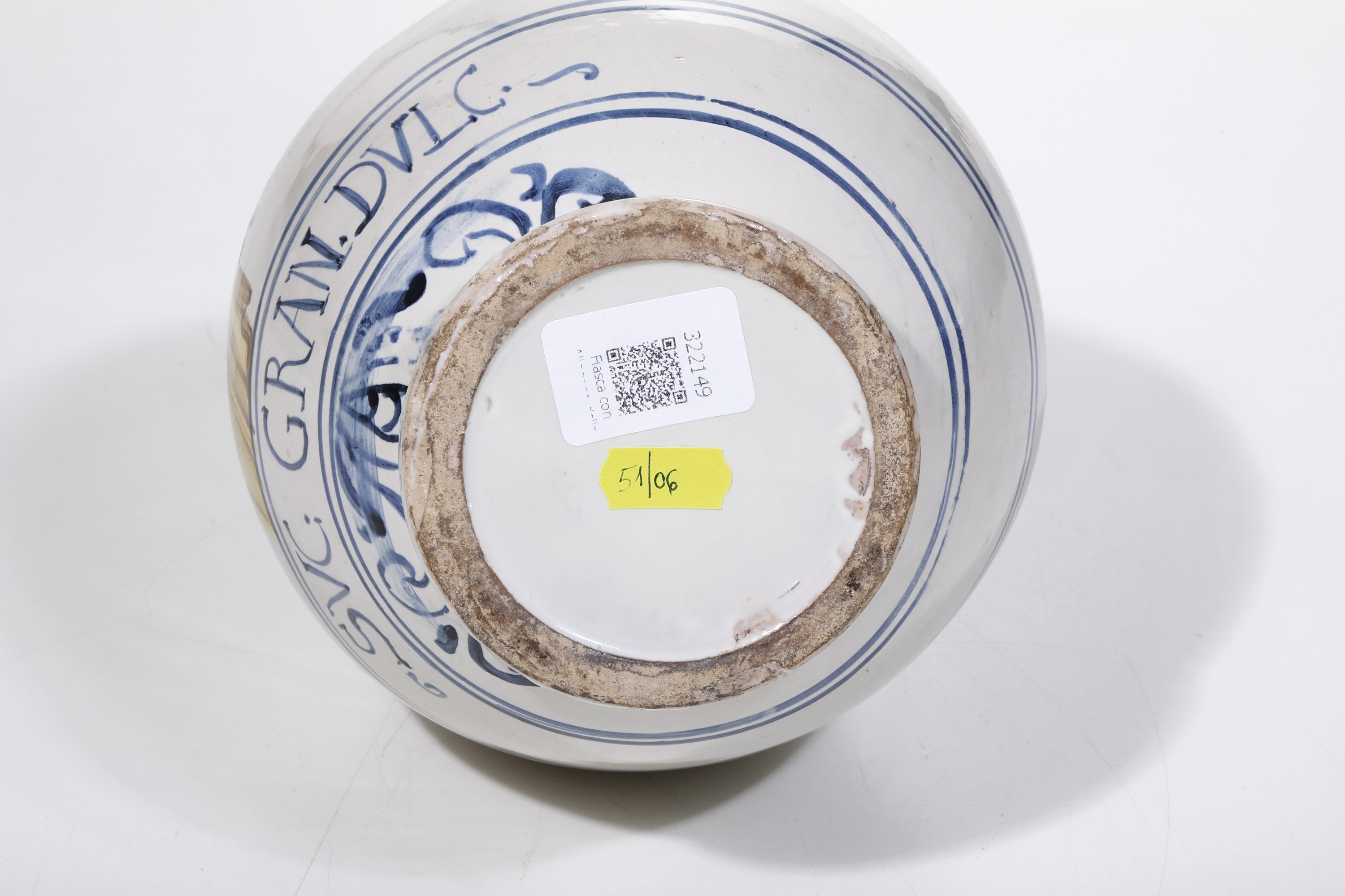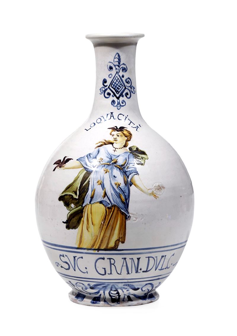 La fiasca poggia su piede svasato, ha corpo ovoidale e alto collo. Interamente rivestita di smalto stannifero è dipinta in policromia con una giovane sormontata dalla scritta “LOQUACITA’”, sulla cui veste poggiano delle cicale, sul capo una rondinella e nella mano destra un cornacchia. La fascia apotecaria porta la scritta “Suc. Gran. Dulc.”