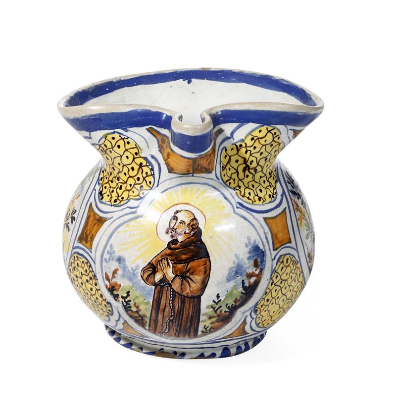 Brocca, modellata al tornio, in terracotta rivestita di smalto stannifero e decorata con colori a gran fuoco. Su piede piatto, il corpo sferico, con bocca trilobata e corta ansa a nastro sono decorati con un motivo a riserve quadrilobate: la maggiore raffigura un santo francescano barbuto. Brocche molto affini, considerate prodotti della manifattura Mordioni di Urbania della II metà del Settecento, sono conservate nel Museo di Tolentino (Stringa, Catalogo delle Ceramiche del Museo del Santuari di Tolentino, Tolentino 2011, pp. 63-64, nn. 95-97)